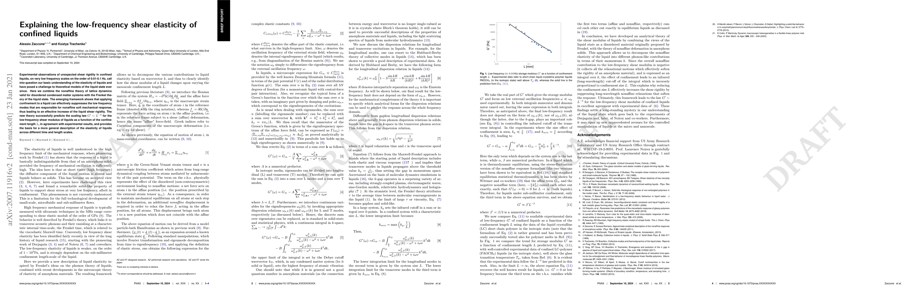 The paper presents a novel theory merging lattice dynamics and Frenkel's liquid state theory, explaining the surprising shear rigidity in confined liquids at low frequencies. It predicts a scaling law G'sim L^-3 for the low-frequency shear modulus, aligning with experimental findings, and provides a broader framework for understanding liquid elasticity across various scales.
