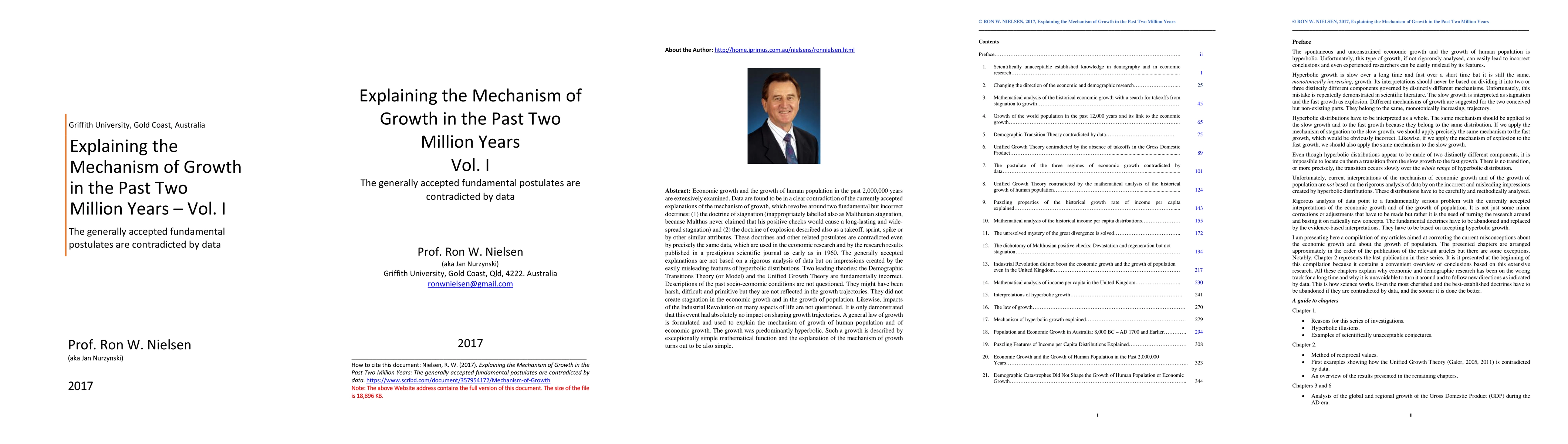 Economic growth and the growth of human population in the past 2,000,000 years are extensively examined. Data are found to be in a clear contradiction of the currently accepted explanations of the mechanism of growth, which revolve around two fundamental but incorrect doctrines: (1) the doctrine of stagnation (inappropriately labelled also as Malthusian stagnation, because Malthus never claimed that his positive checks would cause a long-lasting and wide-spread stagnation) and (2) the doctrine of explosion described also as a takeoff, sprint, spike or by other similar attributes. These doctrines and other related postulates are contradicted even by precisely the same data, which are used in the economic research and by the research results published in a prestigious scientific journal as early as in 1960. The generally accepted explanations are not based on a rigorous analysis of data but on impressions created by the easily misleading features of hyperbolic distributions. Two leading theories: the Demographic Transitions Theory (or Model) and the Unified Growth Theory are fundamentally incorrect. Descriptions of the past socio-economic conditions are not questioned. They might have been harsh, difficult and primitive but they are not reflected in the growth trajectories. They did not create stagnation in the economic growth and in the growth of population. Likewise, impacts of the Industrial Revolution on many aspects of life are not questioned. It is only demonstrated that this event had absolutely no impact on shaping growth trajectories. A general law of growth is formulated and used to explain the mechanism of growth of human population and of economic growth. The growth was predominantly hyperbolic. Such a growth is described by exceptionally simple mathematical function and the explanation of the mechanism of growth turns out to be also simple.