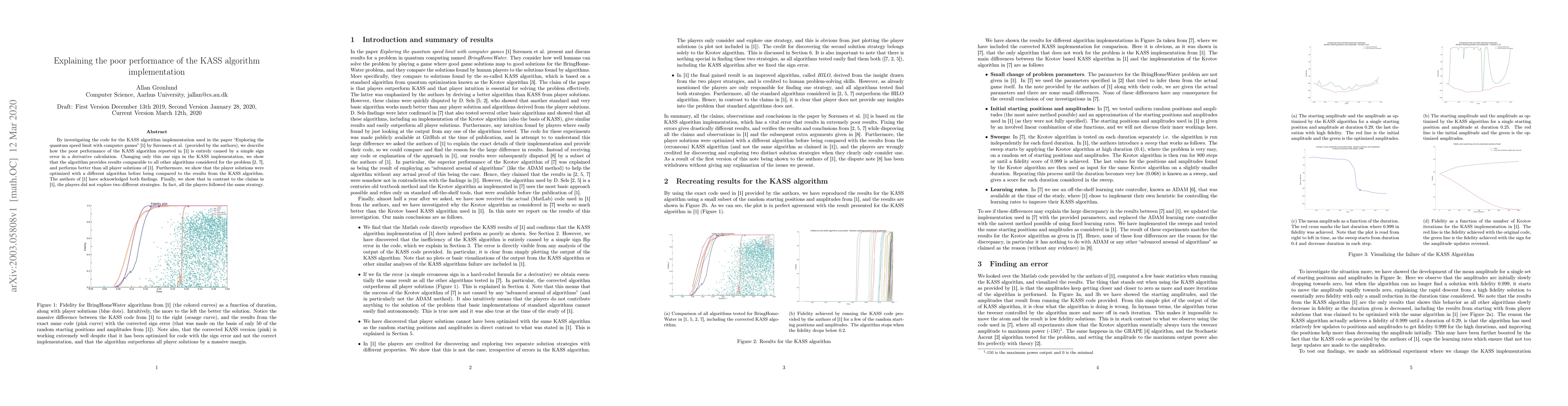 By investigating the code for the KASS algorithm implementation used in the paper "Exploring the quantum speed limit with computer games" [1, arXiv:1506.09091] by S{\o}rensen et al. (provided by the authors), we describe how the poor performance of the KASS algorithm reported in [1] is entirely caused by a simple sign error in a derivative calculation. Changing only this one sign in the KASS implementation, we show that the algorithm provides results comparable to all other algorithms considered for the problem [2,7], and performs better than all player solutions of [1]. Furthermore, we show that the player solutions were optimized with a different algorithm before being compared to the results from the KASS algorithm. The authors of [1] have acknowledged both findings. Finally, we show that in contrast to the claims in [1], the players did not explore two different strategies. In fact, all the players followed the same strategy.