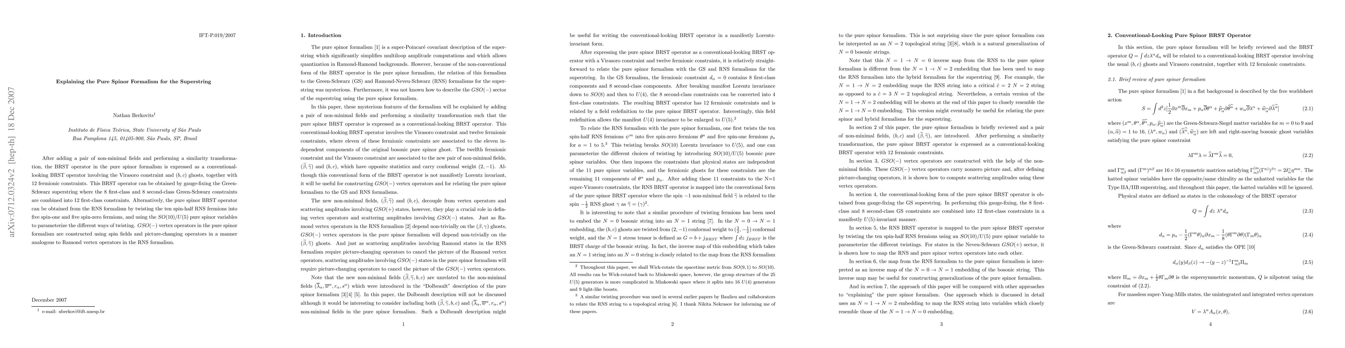The research explains the pure spinor formalism for the superstring by adding a pair of non-minimal fields and performing a similarity transformation, expressing the BRST operator in a conventional form involving Virasoro constraint, (b,c) ghosts, and 12 fermionic constraints. It also discusses gauge-fixing the Green-Schwarz superstring and obtaining the pure spinor BRST operator from the RNS formalism.