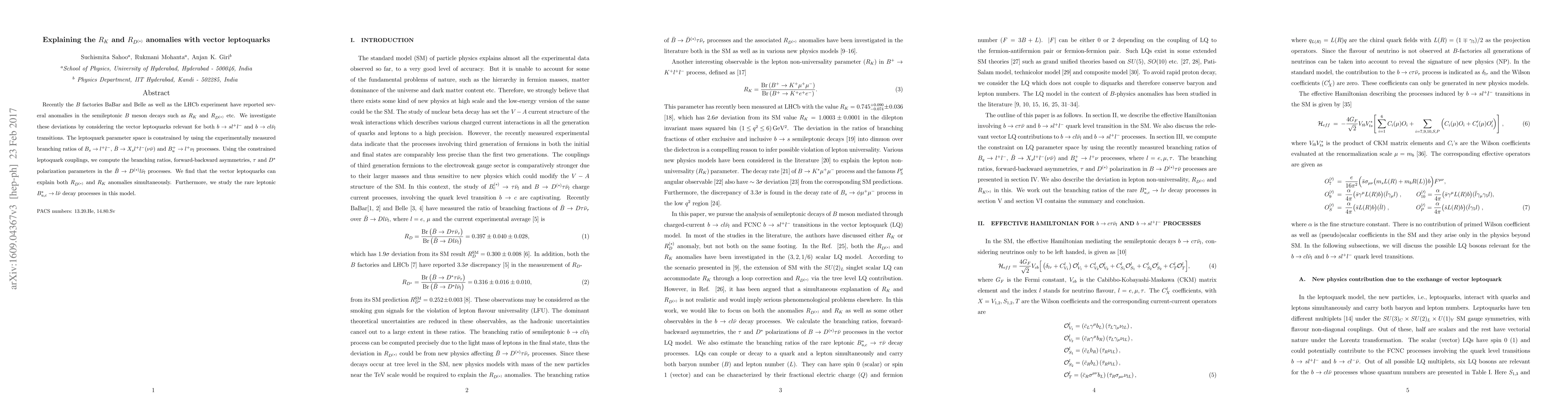 The research investigates the $R_K$ and $R_{D^{(*)}}$ anomalies using vector leptoquarks, constraining leptoquark couplings with experimental data from $B$ meson decays.