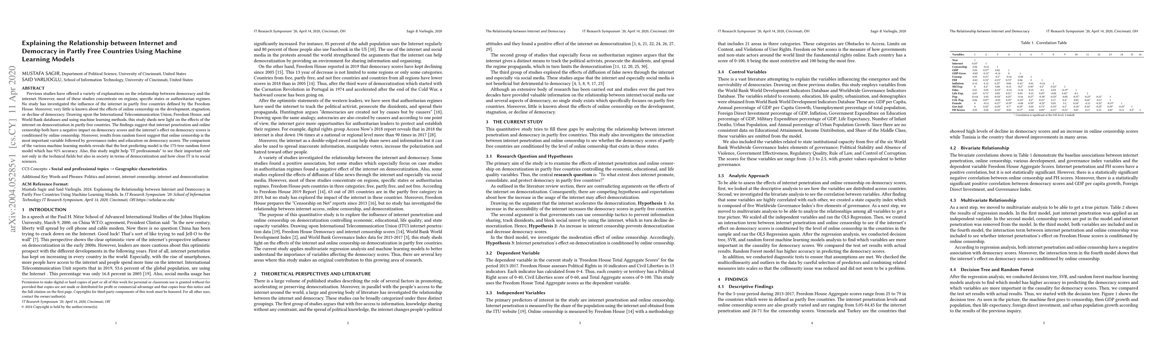 This study uses machine learning models to analyze the impact of internet penetration and online censorship on democracy in partly free countries, finding that both negatively affect democracy scores, with online censorship being the most significant factor. The 175-tree random forest model proves to be the most accurate predictor.