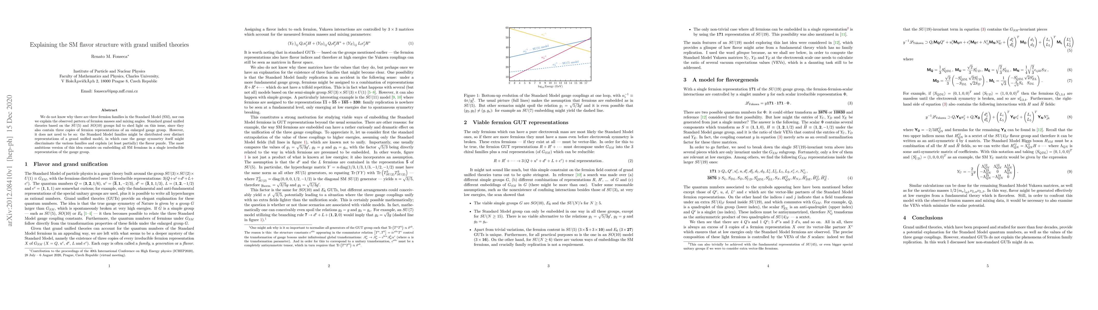 This paper explores how grand unified theories (GUTs) might explain the SM flavor structure by distributing SM families across distinct representations, potentially resolving the mystery of fermion masses and mixing patterns. The most promising approach involves embedding all SM fermions within a single irreducible representation of the GUT gauge group.