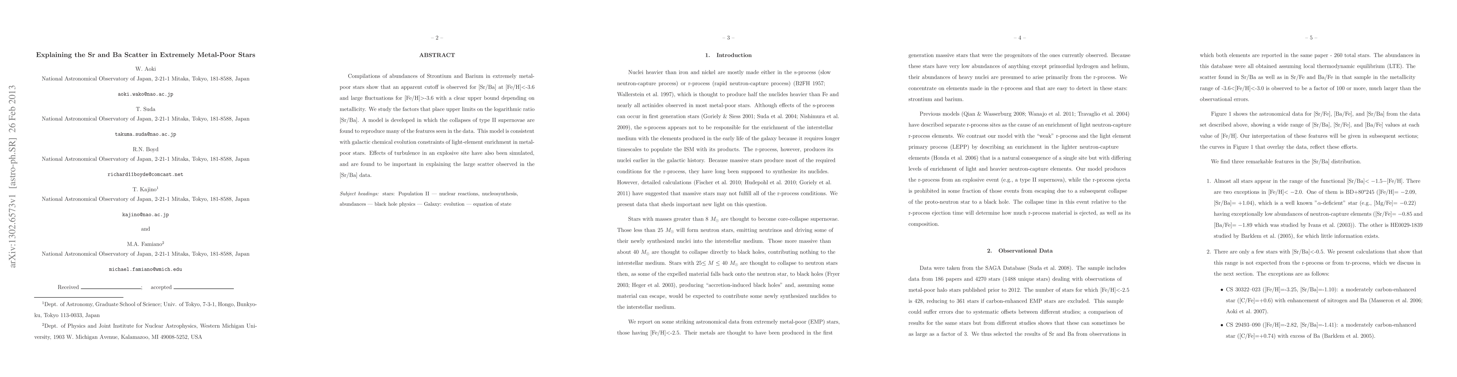 This paper investigates the Sr and Ba abundance scatter in extremely metal-poor stars, finding a cutoff at [Fe/H]<-3.6 and large fluctuations above this threshold. The study proposes a model where type II supernovae collapses and turbulence in explosive environments explain the observed Sr/Ba ratio variations.