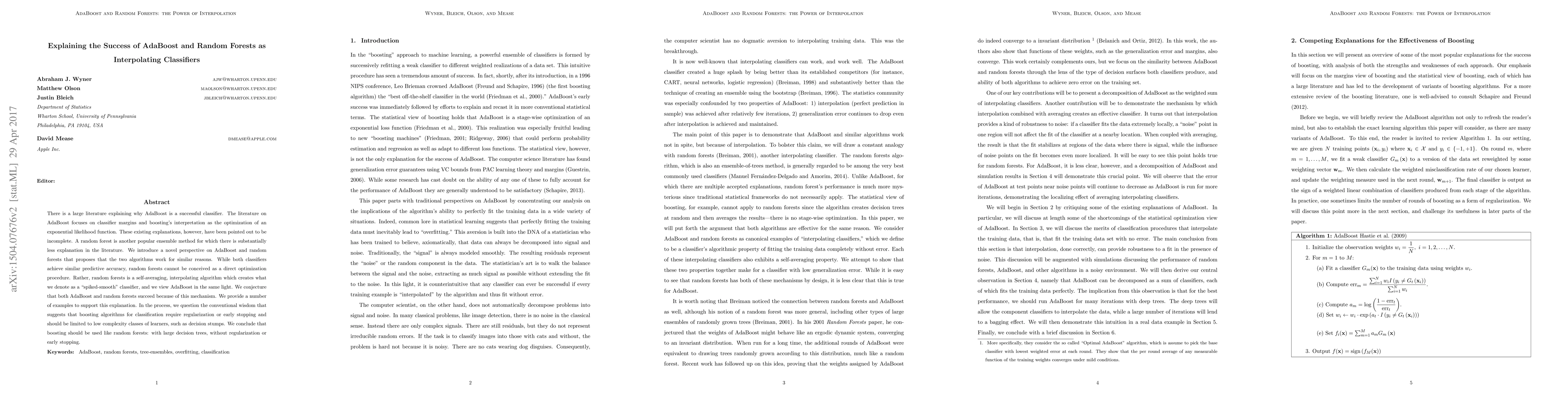 This paper proposes a new explanation for why AdaBoost and Random Forests succeed as interpolating classifiers, suggesting that both algorithms create a "spikey-smooth" classifier through self-averaging mechanisms, challenging conventional wisdom on boosting algorithms.