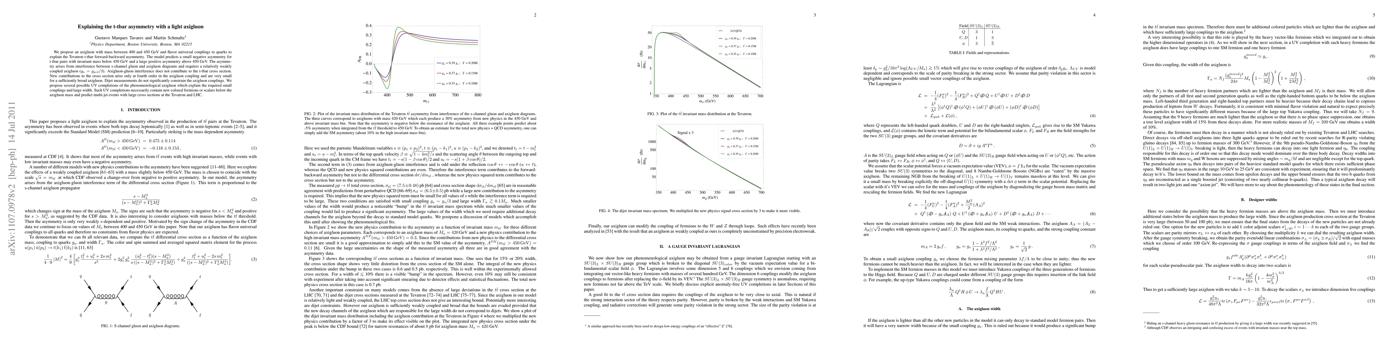 This paper proposes a light axigluon with mass between 400 and 450 GeV to explain the Tevatron's t-tbar forward-backward asymmetry through flavor universal couplings. The model predicts distinct asymmetries depending on the invariant mass of t-tbar pairs and suggests possible UV completions involving new colored fermions or scalars.