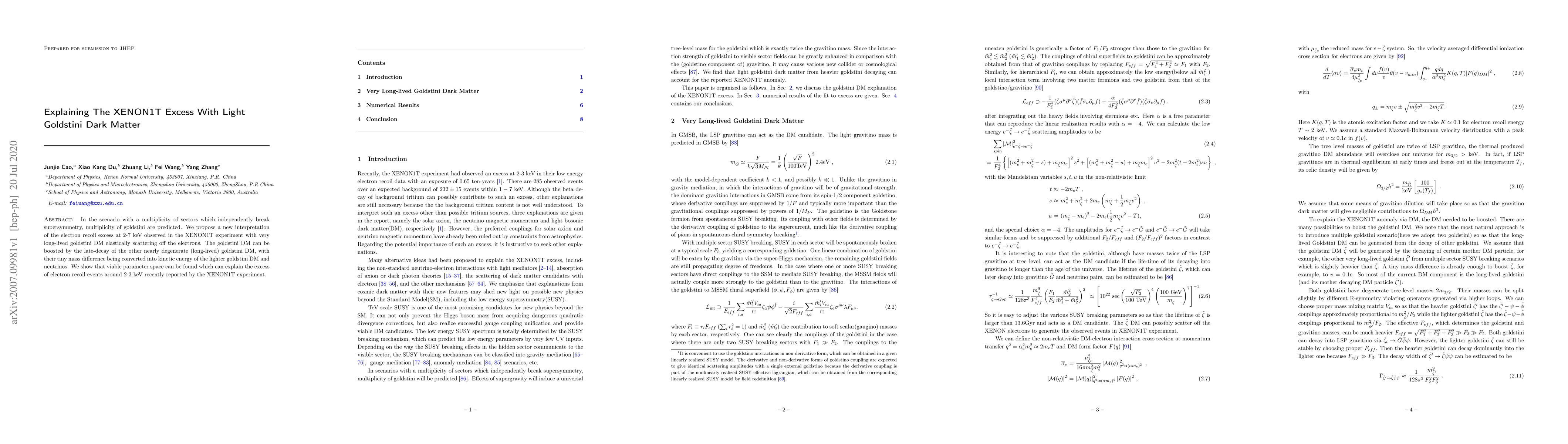 This paper proposes that the electron recoil excess observed in the XENON1T experiment at 2-7 keV can be explained by very long-lived goldstini dark matter particles, which are predicted in the presence of multiple supersymmetry-breaking sectors. The authors suggest that these goldstini can be boosted by the late decay of nearly degenerate, long-lived goldstini, providing a viable parameter space to explain the observed excess.
