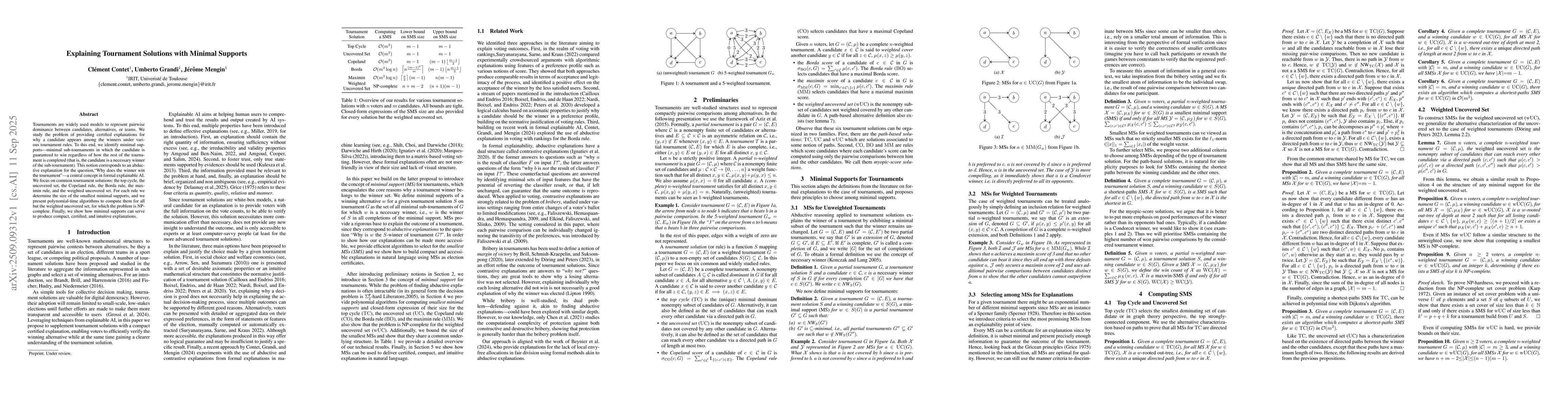 Tournaments are widely used models to represent pairwise dominance between candidates, alternatives, or teams. We study the problem of providing certified explanations for why a candidate appears among the winners under various tournament rules. To this end, we identify minimal supports, minimal sub-tournaments in which the candidate is guaranteed to win regardless of how the rest of the tournament is completed (that is, the candidate is a necessary winner of the sub-tournament). This notion corresponds to an abductive explanation for the question,"Why does the winner win the tournament", a central concept in formal explainable AI. We focus on common tournament solutions: the top cycle, the uncovered set, the Copeland rule, the Borda rule, the maximin rule, and the weighted uncovered set. For each rule we determine the size of the smallest minimal supports, and we present polynomial-time algorithms to compute them for all but the weighted uncovered set, for which the problem is NP-complete. Finally, we show how minimal supports can serve to produce compact, certified, and intuitive explanations.