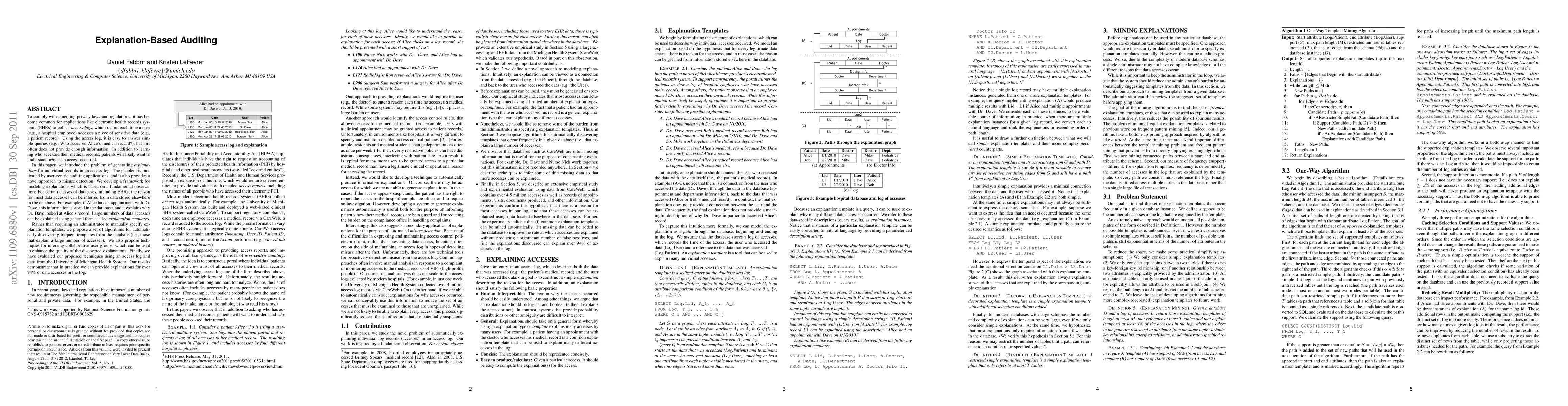 To comply with emerging privacy laws and regulations, it has become common for applications like electronic health records systems (EHRs) to collect access logs, which record each time a user (e.g., a hospital employee) accesses a piece of sensitive data (e.g., a patient record). Using the access log, it is easy to answer simple queries (e.g., Who accessed Alice's medical record?), but this often does not provide enough information. In addition to learning who accessed their medical records, patients will likely want to understand why each access occurred. In this paper, we introduce the problem of generating explanations for individual records in an access log. The problem is motivated by user-centric auditing applications, and it also provides a novel approach to misuse detection. We develop a framework for modeling explanations which is based on a fundamental observation: For certain classes of databases, including EHRs, the reason for most data accesses can be inferred from data stored elsewhere in the database. For example, if Alice has an appointment with Dr. Dave, this information is stored in the database, and it explains why Dr. Dave looked at Alice's record. Large numbers of data accesses can be explained using general forms called explanation templates. Rather than requiring an administrator to manually specify explanation templates, we propose a set of algorithms for automatically discovering frequent templates from the database (i.e., those that explain a large number of accesses). We also propose techniques for inferring collaborative user groups, which can be used to enhance the quality of the discovered explanations. Finally, we have evaluated our proposed techniques using an access log and data from the University of Michigan Health System. Our results demonstrate that in practice we can provide explanations for over 94% of data accesses in the log.