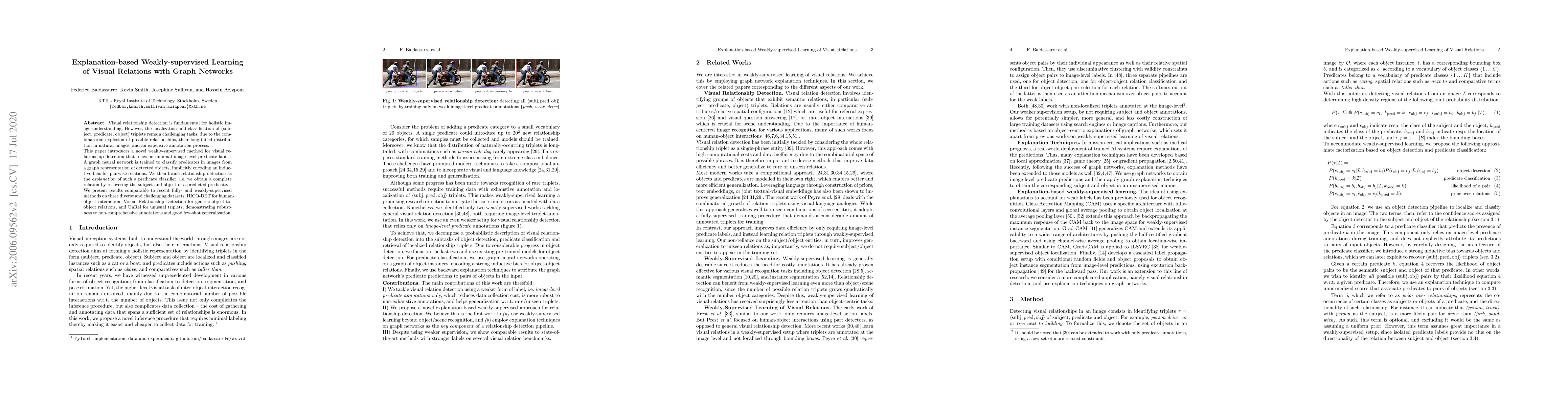 Visual relationship detection is fundamental for holistic image understanding. However, the localization and classification of (subject, predicate, object) triplets remain challenging tasks, due to the combinatorial explosion of possible relationships, their long-tailed distribution in natural images, and an expensive annotation process. This paper introduces a novel weakly-supervised method for visual relationship detection that relies on minimal image-level predicate labels. A graph neural network is trained to classify predicates in images from a graph representation of detected objects, implicitly encoding an inductive bias for pairwise relations. We then frame relationship detection as the explanation of such a predicate classifier, i.e. we obtain a complete relation by recovering the subject and object of a predicted predicate. We present results comparable to recent fully- and weakly-supervised methods on three diverse and challenging datasets: HICO-DET for human-object interaction, Visual Relationship Detection for generic object-to-object relations, and UnRel for unusual triplets; demonstrating robustness to non-comprehensive annotations and good few-shot generalization.