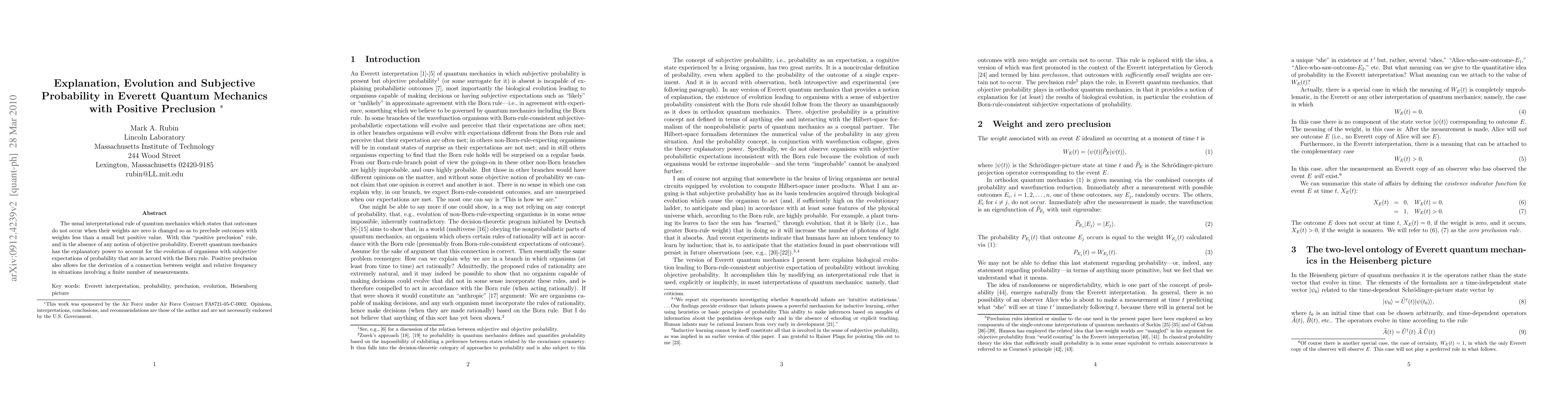 This paper proposes a "positive preclusion" rule in Everett quantum mechanics, which excludes outcomes with weights below a small positive value, enabling the theory to explain the evolution of organisms with subjective probability expectations aligning with the Born rule. It also establishes a link between weight and relative frequency in finite measurement scenarios.