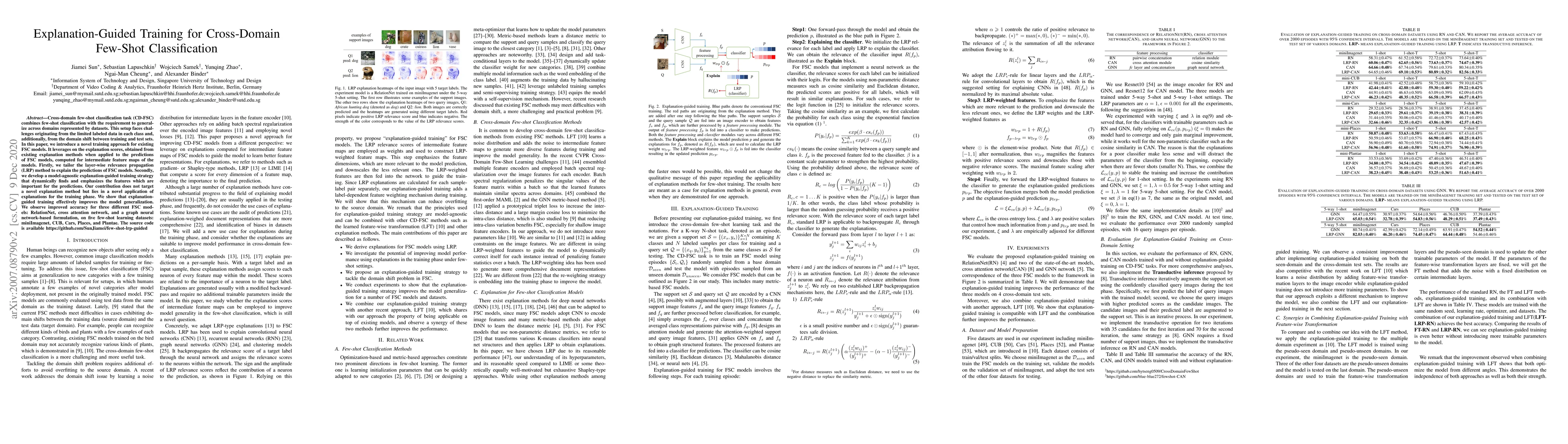 This paper proposes an explanation-guided training method for cross-domain few-shot classification, leveraging layer-wise relevance propagation to identify important features for model predictions. The approach dynamically enhances model generalization, resulting in improved accuracy across three FSC models on five datasets.