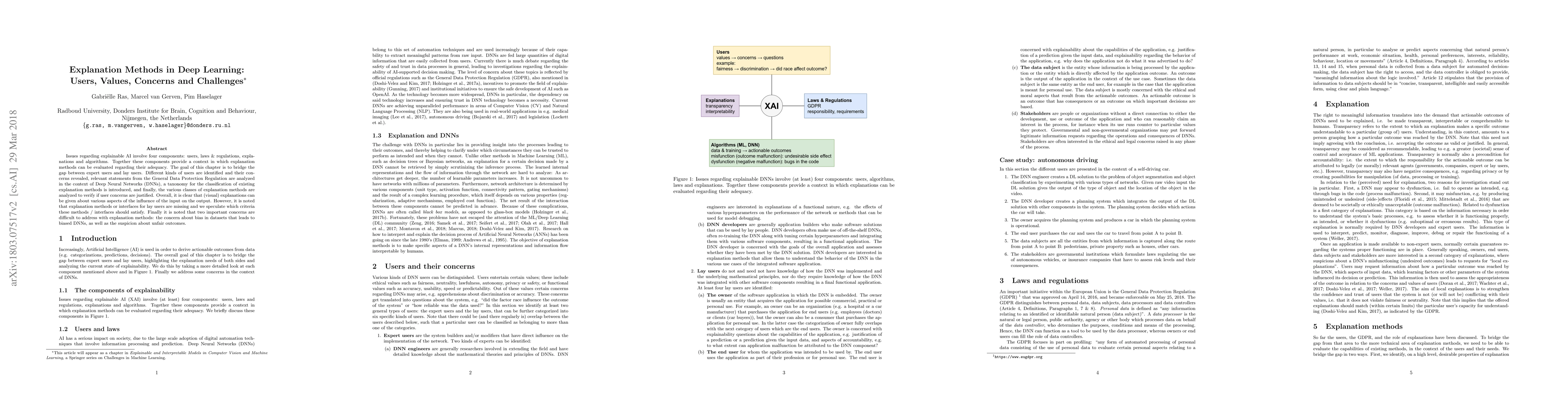 Issues regarding explainable AI involve four components: users, laws & regulations, explanations and algorithms. Together these components provide a context in which explanation methods can be evaluated regarding their adequacy. The goal of this chapter is to bridge the gap between expert users and lay users. Different kinds of users are identified and their concerns revealed, relevant statements from the General Data Protection Regulation are analyzed in the context of Deep Neural Networks (DNNs), a taxonomy for the classification of existing explanation methods is introduced, and finally, the various classes of explanation methods are analyzed to verify if user concerns are justified. Overall, it is clear that (visual) explanations can be given about various aspects of the influence of the input on the output. However, it is noted that explanation methods or interfaces for lay users are missing and we speculate which criteria these methods / interfaces should satisfy. Finally it is noted that two important concerns are difficult to address with explanation methods: the concern about bias in datasets that leads to biased DNNs, as well as the suspicion about unfair outcomes.