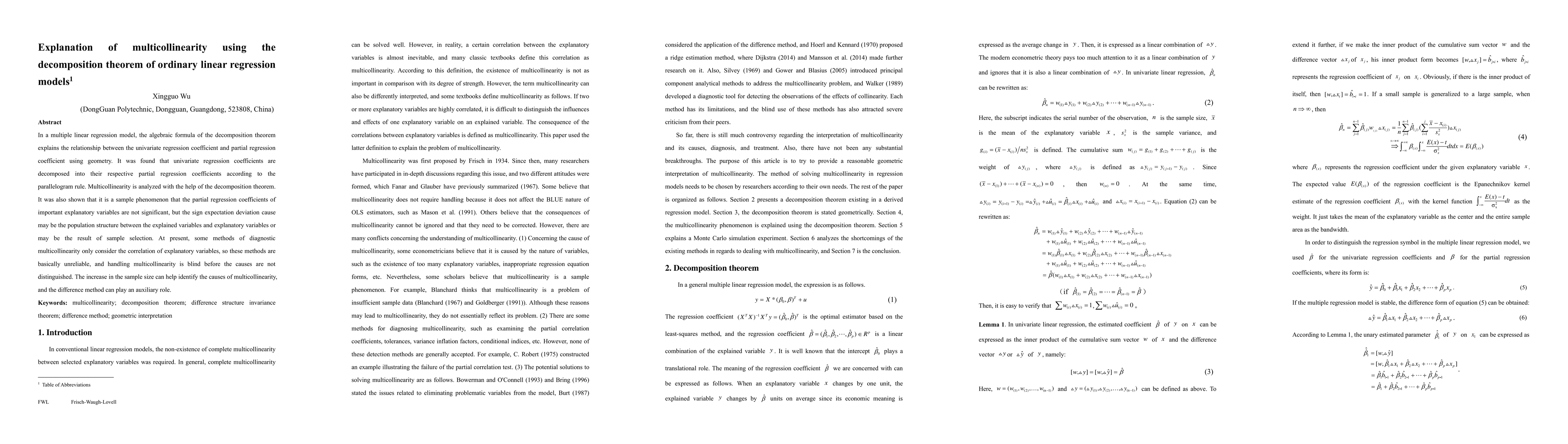 In a multiple linear regression model, the algebraic formula of the decomposition theorem explains the relationship between the univariate regression coefficient and partial regression coefficient using geometry. It was found that univariate regression coefficients are decomposed into their respective partial regression coefficients according to the parallelogram rule. Multicollinearity is analyzed with the help of the decomposition theorem. It was also shown that it is a sample phenomenon that the partial regression coefficients of important explanatory variables are not significant, but the sign expectation deviation cause may be the population structure between the explained variables and explanatory variables or may be the result of sample selection. At present, some methods of diagnostic multicollinearity only consider the correlation of explanatory variables, so these methods are basically unreliable, and handling multicollinearity is blind before the causes are not distinguished. The increase in the sample size can help identify the causes of multicollinearity, and the difference method can play an auxiliary role.