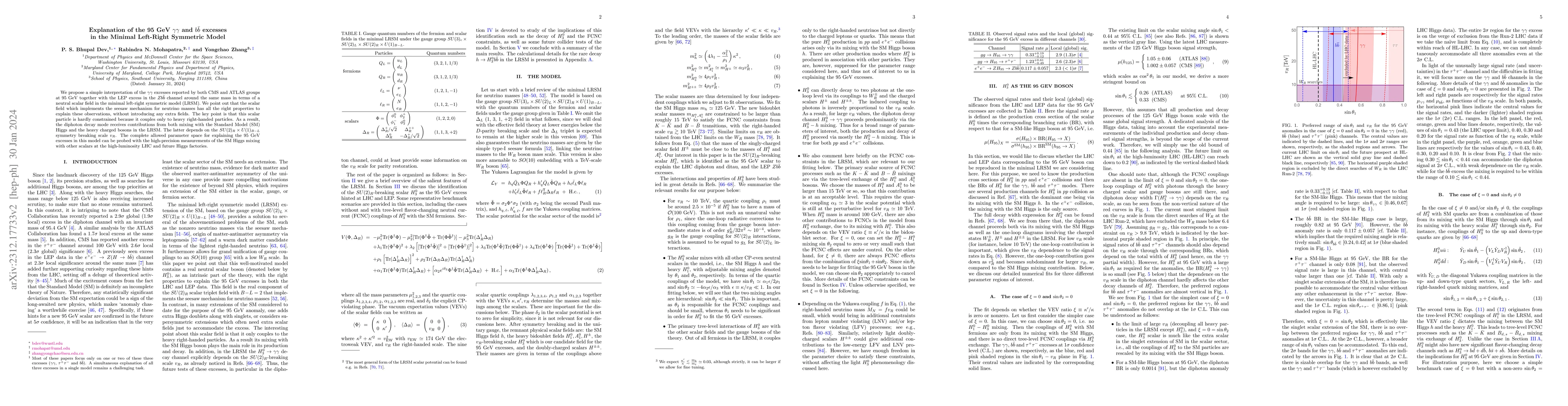 This paper explains the 95 GeV gamma-gamma and $b\bar{b}$ excesses observed by CMS and ATLAS using a neutral scalar field in the minimal left-right symmetric model, without introducing extra scalar fields. The model's parameter space can be tested with future high-precision LHC and Higgs factory measurements.