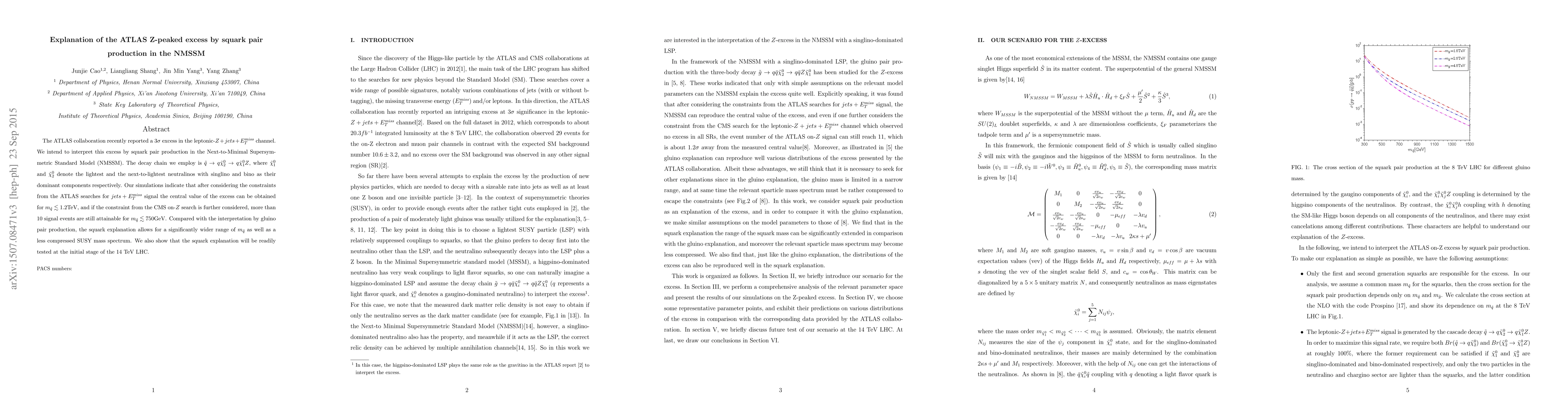 The ATLAS collaboration reported a $3\sigma$ excess in the $Z+jets+E_{T}^{miss}$ channel, which is interpreted by squark pair production in the NMSSM. Simulations suggest that this excess can be explained by squark masses up to 1.2 TeV, with a less compressed SUSY mass spectrum compared to gluino pair production.
