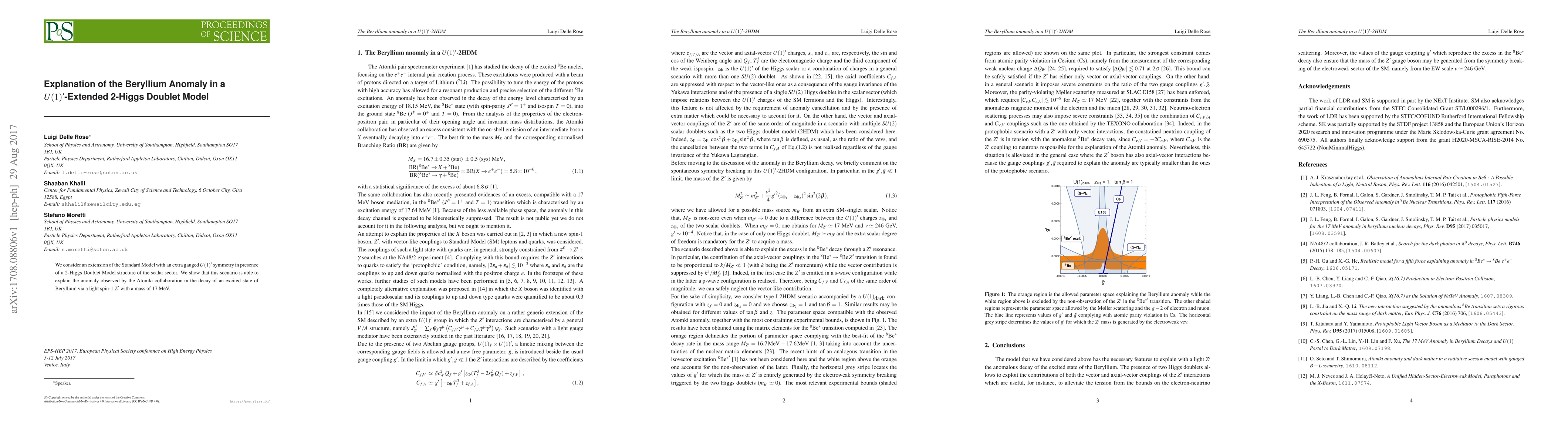 This paper extends the Standard Model with an extra gauged $U(1)'$ symmetry and a 2-Higgs Doublet structure, demonstrating that it can explain the Beryllium anomaly observed in the decay of an excited Beryllium state via a light 17 MeV spin-1 $Z'$ boson.
