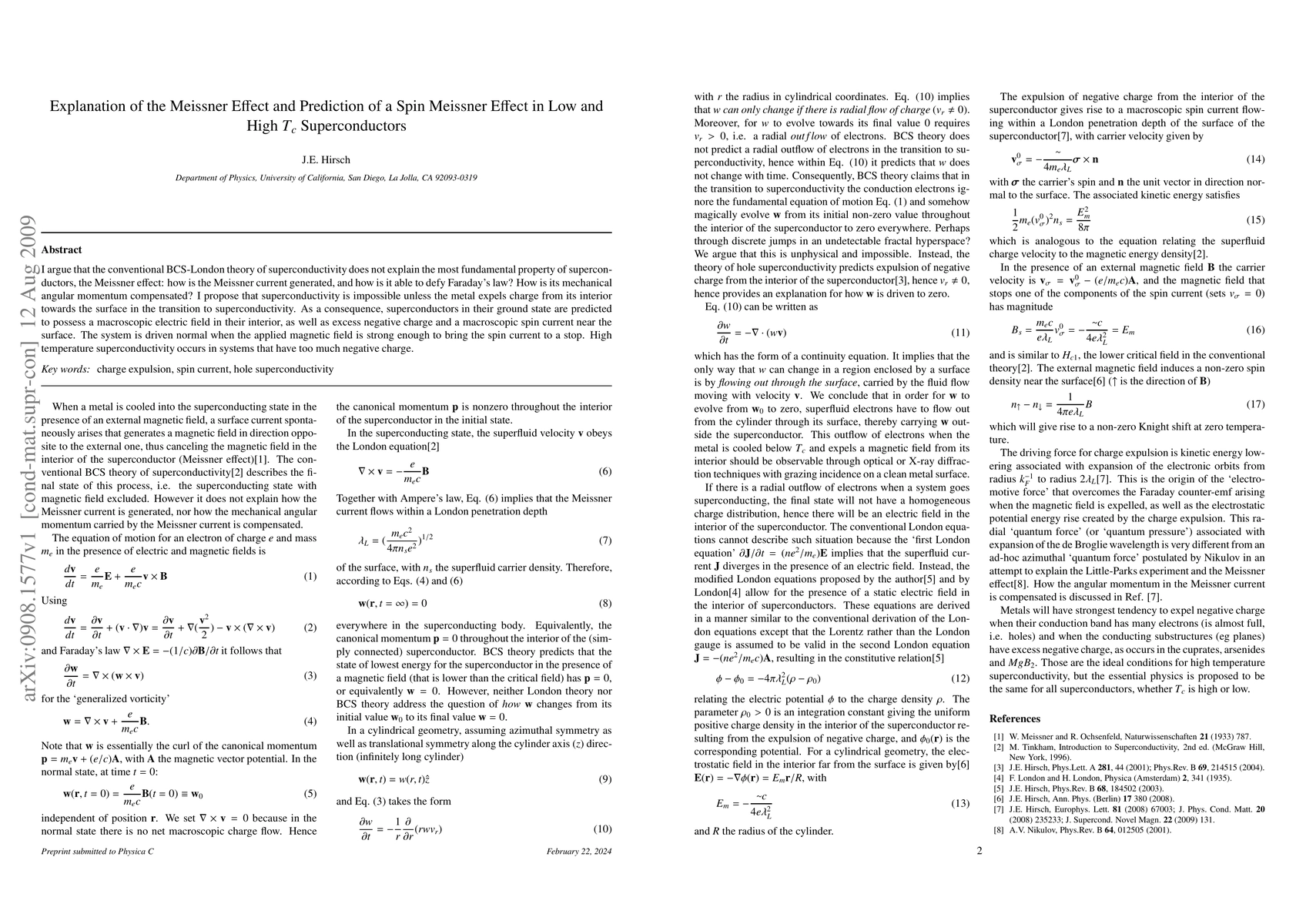 This paper critiques the conventional BCS-London theory of superconductivity, proposing a new explanation for the Meissner effect and introducing a "spin Meissner effect." It suggests that superconductors expel charge to the surface, creating a macroscopic electric field and spin current, which is disrupted by strong magnetic fields.