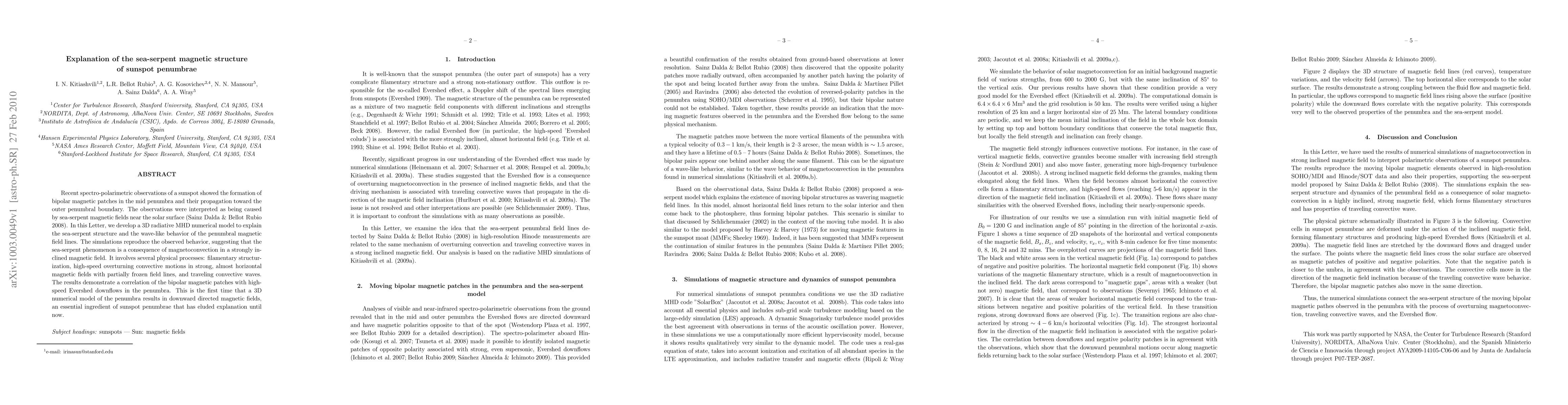 This paper develops a 3D radiative MHD numerical model to explain the sea-serpent magnetic structure in sunspot penumbrae, attributing it to magnetoconvection in a strongly inclined magnetic field. The model successfully reproduces observed wave-like behavior and correlates bipolar magnetic patches with high-speed Evershed downflows.