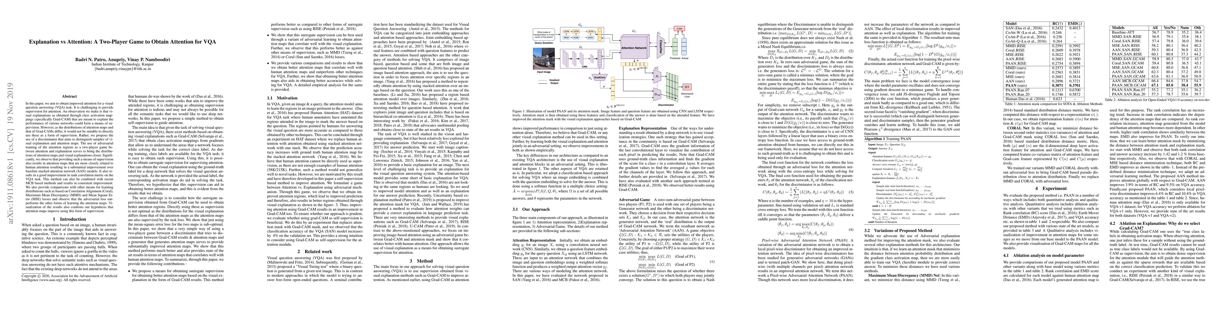 In this paper, we aim to obtain improved attention for a visual question answering (VQA) task. It is challenging to provide supervision for attention. An observation we make is that visual explanations as obtained through class activation mappings (specifically Grad-CAM) that are meant to explain the performance of various networks could form a means of supervision. However, as the distributions of attention maps and that of Grad-CAMs differ, it would not be suitable to directly use these as a form of supervision. Rather, we propose the use of a discriminator that aims to distinguish samples of visual explanation and attention maps. The use of adversarial training of the attention regions as a two-player game between attention and explanation serves to bring the distributions of attention maps and visual explanations closer. Significantly, we observe that providing such a means of supervision also results in attention maps that are more closely related to human attention resulting in a substantial improvement over baseline stacked attention network (SAN) models. It also results in a good improvement in rank correlation metric on the VQA task. This method can also be combined with recent MCB based methods and results in consistent improvement. We also provide comparisons with other means for learning distributions such as based on Correlation Alignment (Coral), Maximum Mean Discrepancy (MMD) and Mean Square Error (MSE) losses and observe that the adversarial loss outperforms the other forms of learning the attention maps. Visualization of the results also confirms our hypothesis that attention maps improve using this form of supervision.
