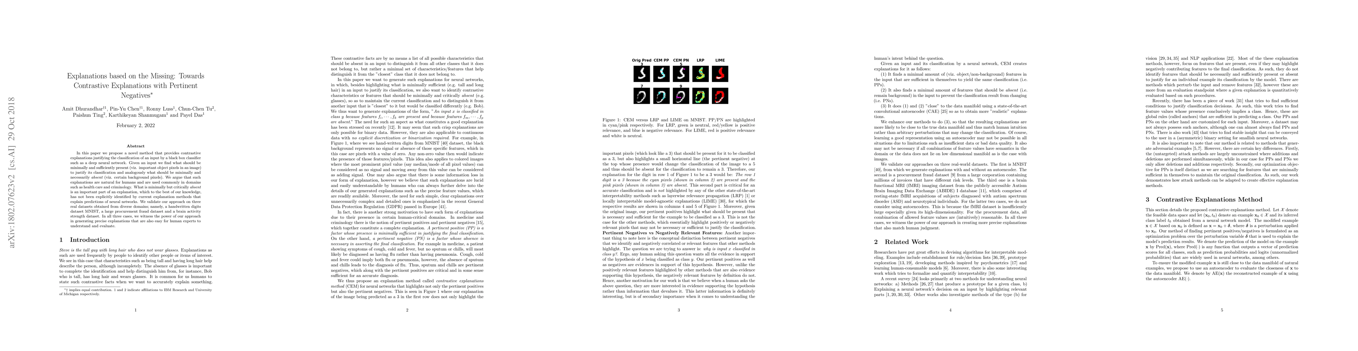 Researchers propose a method to provide contrastive explanations for black box classifiers, identifying essential features present in input data that justify classification and absent features that contradict it.