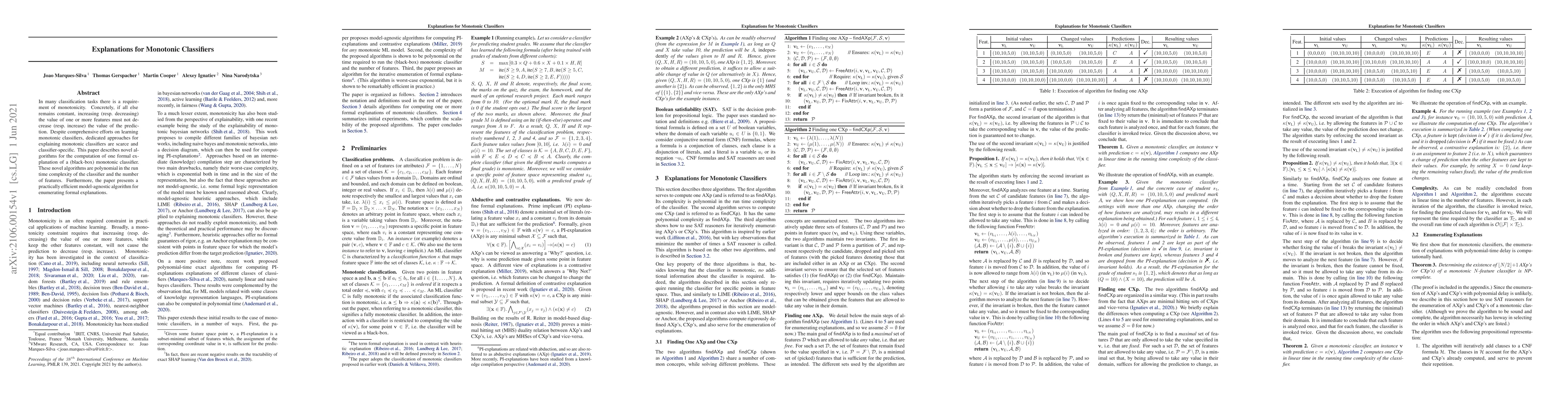 This paper introduces novel algorithms for computing formal explanations of monotonic classifiers, which are required to maintain predictable behavior under feature changes.