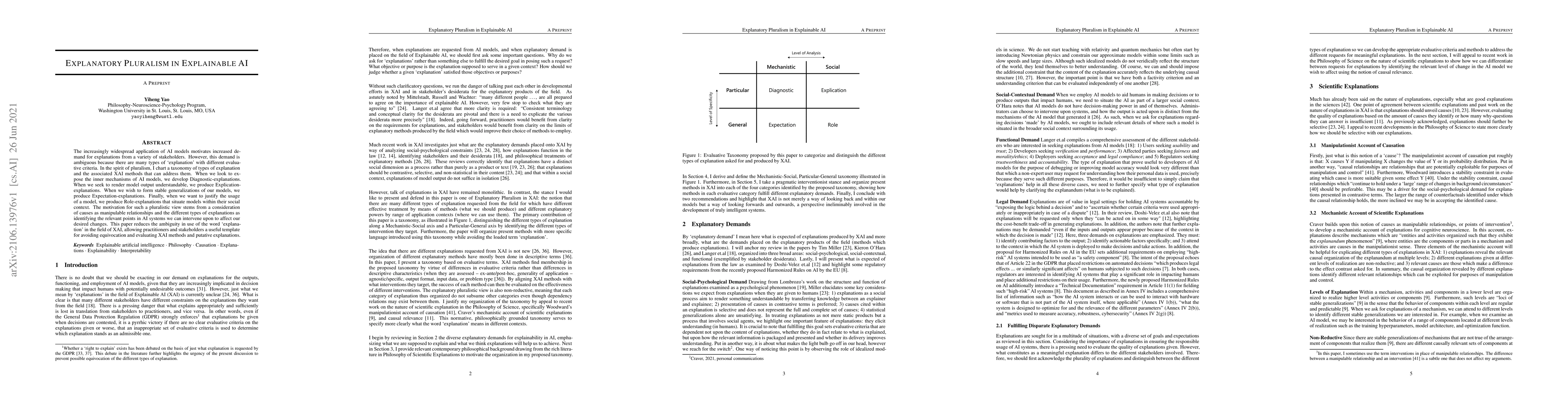 This paper proposes explanatory pluralism in explainable AI, categorizing various types of explanations—Diagnostic, Explication, Expectation, and Role—each with distinct evaluative criteria and associated XAI methods. It aims to clarify the ambiguous use of 'explanation' in XAI, providing a framework for practitioners to evaluate and select appropriate explanations.