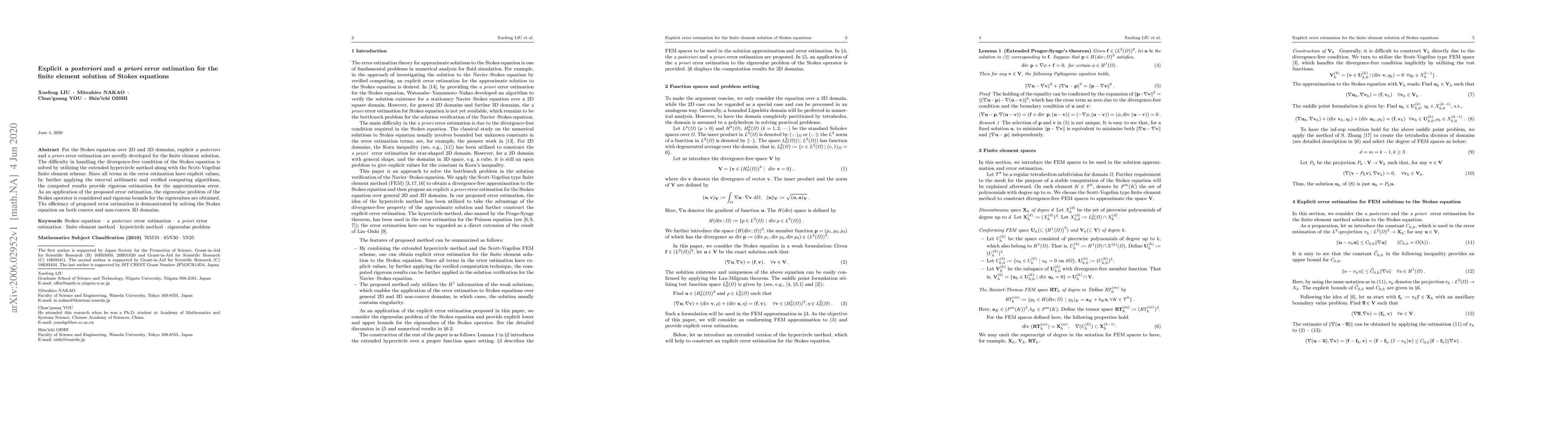 This paper develops explicit a posteriori and a priori error estimation methods for finite element solutions of the Stokes equations in 2D and 3D domains. The extended hypercircle method and Scott-Vogelius scheme are used to handle the divergence-free condition, providing rigorous bounds for approximation errors through verified computing algorithms.