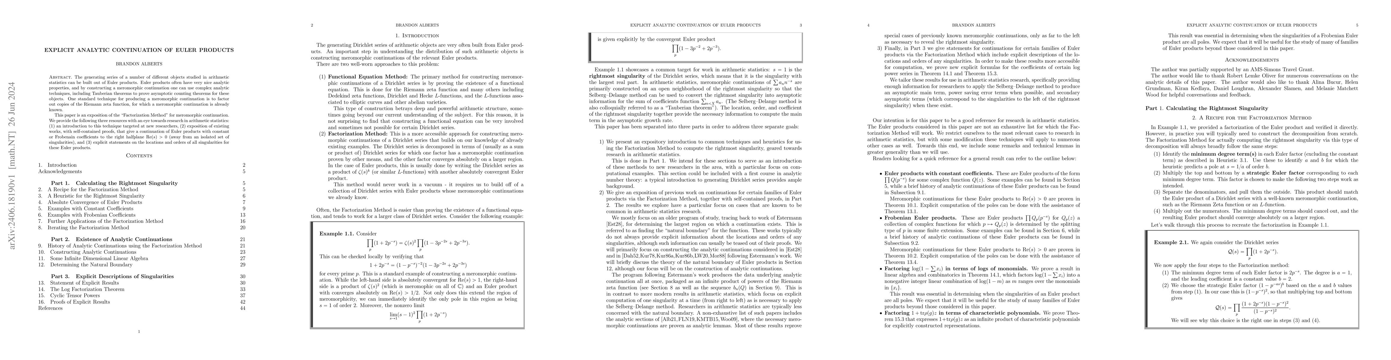 This paper explains the "Factorization Method" for achieving meromorphic continuation of Euler products, providing an introduction for new researchers, self-contained proofs for existing continuations, and detailed information on the locations and orders of singularities. It aims to facilitate research in arithmetic statistics by leveraging complex analytic techniques.