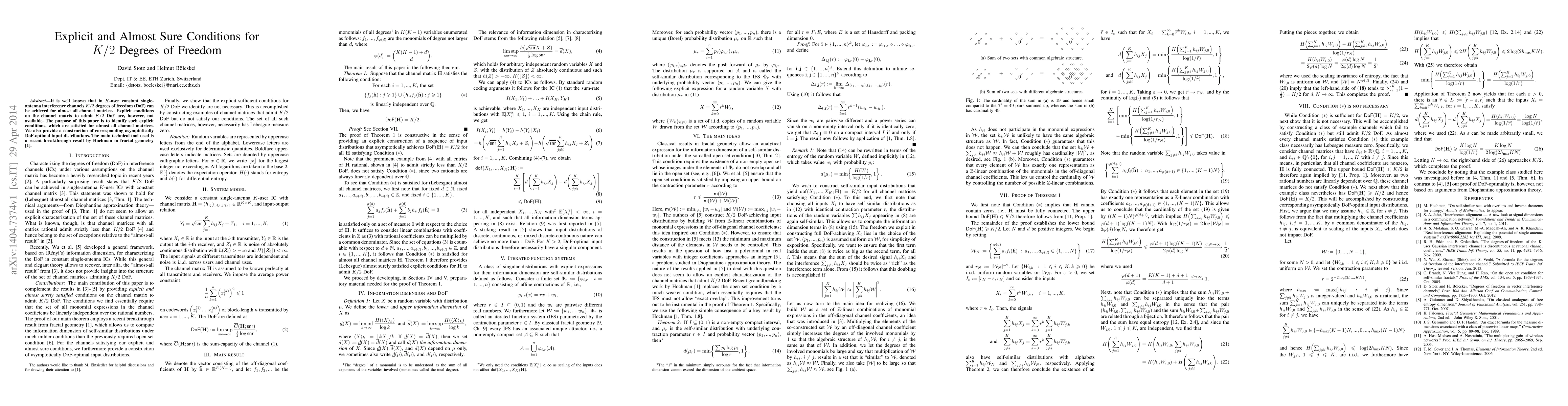 It is well known that in K-user constant single-antenna interference channels K/2 degrees of freedom (DoF) can be achieved for almost all channel matrices. Explicit conditions on the channel matrix to admit K/2 DoF are, however, not available. The purpose of this paper is to identify such explicit conditions, which are satisfied for almost all channel matrices. We also provide a construction of corresponding asymptotically DoF-optimal input distributions. The main technical tool used is a recent breakthrough result by Hochman in fractal geometry.