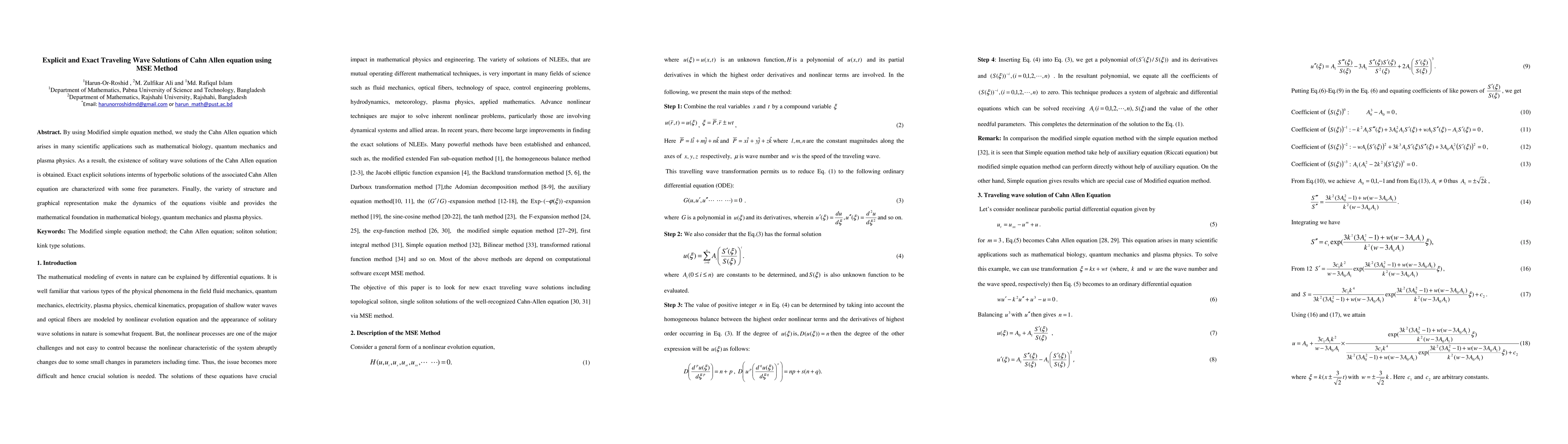 This paper utilizes the Modified Simple Equation Method to derive explicit and exact traveling wave solutions for the Cahn Allen equation, revealing solitary wave solutions and providing graphical representations that enhance the understanding of its dynamics in applications like mathematical biology, quantum mechanics, and plasma physics.