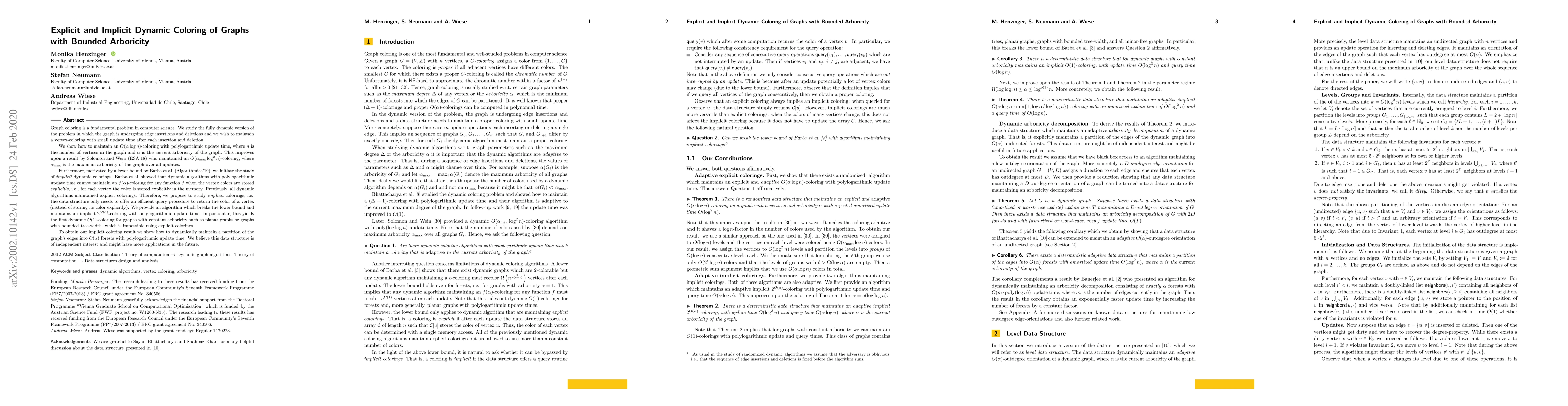 Graph coloring is a fundamental problem in computer science. We study the fully dynamic version of the problem in which the graph is undergoing edge insertions and deletions and we wish to maintain a vertex-coloring with small update time after each insertion and deletion. We show how to maintain an $O(\alpha \lg n)$-coloring with polylogarithmic update time, where $n$ is the number of vertices in the graph and $\alpha$ is the current arboricity of the graph. This improves upon a result by Solomon and Wein (ESA'18) who maintained an $O(\alpha_{\max}\lg^2 n)$-coloring, where $\alpha_{\max}$ is the maximum arboricity of the graph over all updates. Furthermore, motivated by a lower bound by Barba et al. (Algorithmica'19), we initiate the study of implicit dynamic colorings. Barba et al. showed that dynamic algorithms with polylogarithmic update time cannot maintain an $f(\alpha)$-coloring for any function $f$ when the vertex colors are stored explicitly, i.e., for each vertex the color is stored explicitly in the memory. Previously, all dynamic algorithms maintained explicit colorings. Therefore, we propose to study implicit colorings, i.e., the data structure only needs to offer an efficient query procedure to return the color of a vertex (instead of storing its color explicitly). We provide an algorithm which breaks the lower bound and maintains an implicit $2^{O(\alpha)}$-coloring with polylogarithmic update time. In particular, this yields the first dynamic $O(1)$-coloring for graphs with constant arboricity such as planar graphs or graphs with bounded tree-width, which is impossible using explicit colorings. We also show how to dynamically maintain a partition of the graph's edges into $O(\alpha)$ forests with polylogarithmic update time. We believe this data structure is of independent interest and might have more applications in the future.