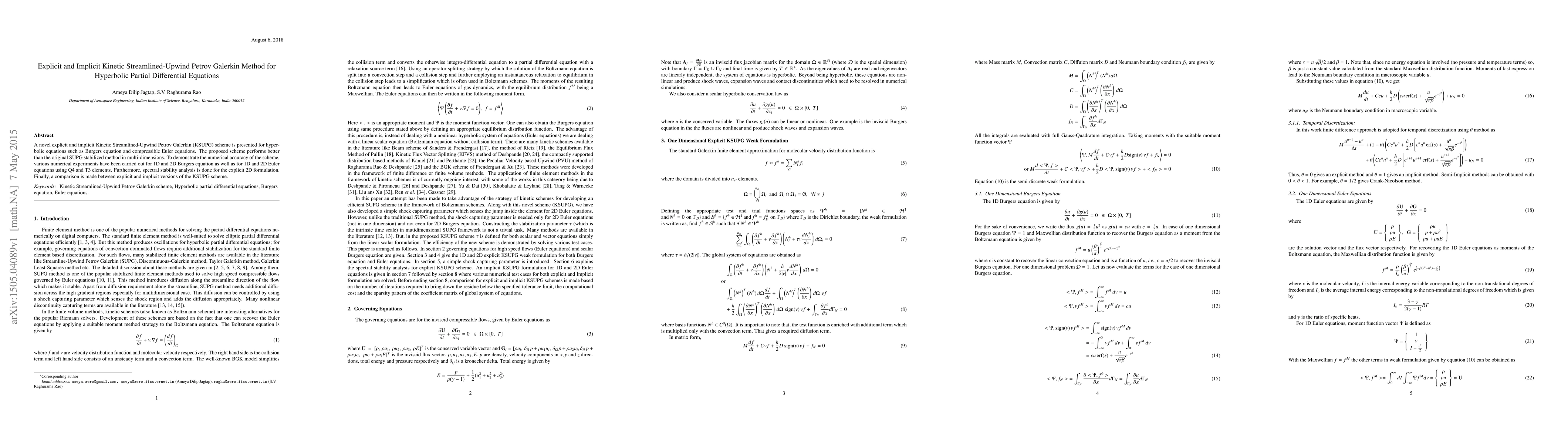 This paper introduces an improved explicit and implicit Kinetic Streamlined-Upwind Petrov Galerkin (KSUPG) method for solving hyperbolic PDEs like Burgers and Euler equations, showing superior performance over traditional SUPG methods. Numerical experiments and spectral stability analysis confirm the method's accuracy and efficiency.