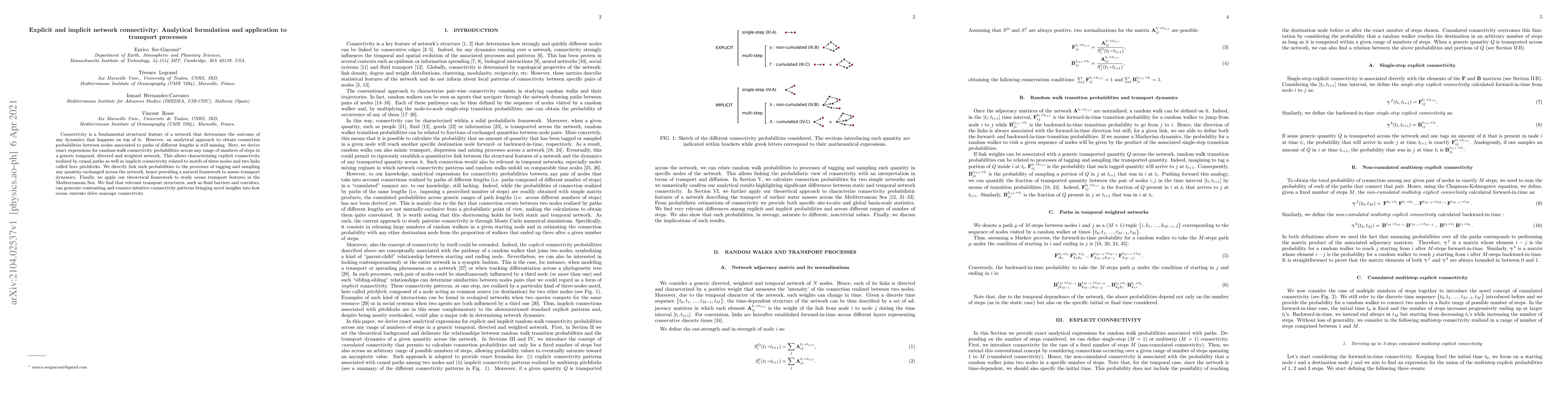 Connectivity is a fundamental structural feature of a network that determines the outcome of any dynamics that happens on top of it. However, an analytical approach to obtain connection probabilities between nodes associated to paths of different lengths is still missing. Here, we derive exact expressions for random-walk connectivity probabilities across any range of numbers of steps in a generic temporal, directed and weighted network. This allows characterizing explicit connectivity realized by causal paths as well as implicit connectivity related to motifs of three nodes and two links called here pitchforks. We directly link such probabilities to the processes of tagging and sampling any quantity exchanged across the network, hence providing a natural framework to assess transport dynamics. Finally, we apply our theoretical framework to study ocean transport features in the Mediterranean Sea. We find that relevant transport structures, such as fluid barriers and corridors, can generate contrasting and counter-intuitive connectivity patterns bringing novel insights into how ocean currents drive seascape connectivity.