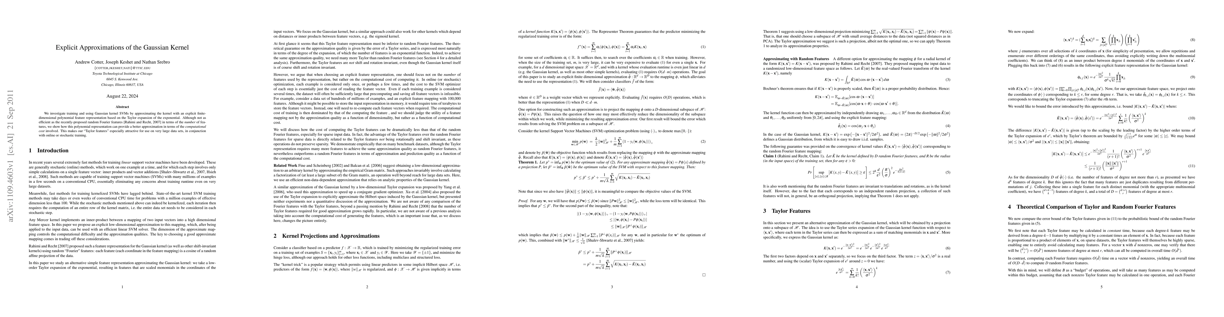 The development of a new method for approximating the Gaussian kernel using explicit monomial features and random Fourier features.