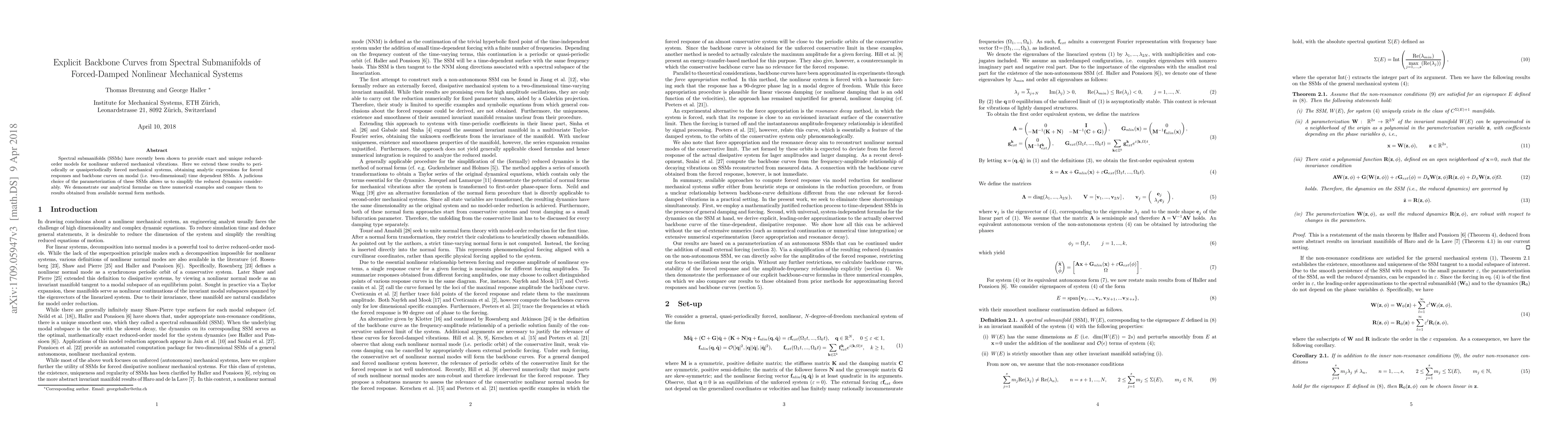 This paper extends spectral submanifolds to forced-damped nonlinear mechanical systems, deriving analytic expressions for backbone curves and simplifying the reduced dynamics through careful parameterization. The proposed method is validated against numerical examples and compared to normal form methods.