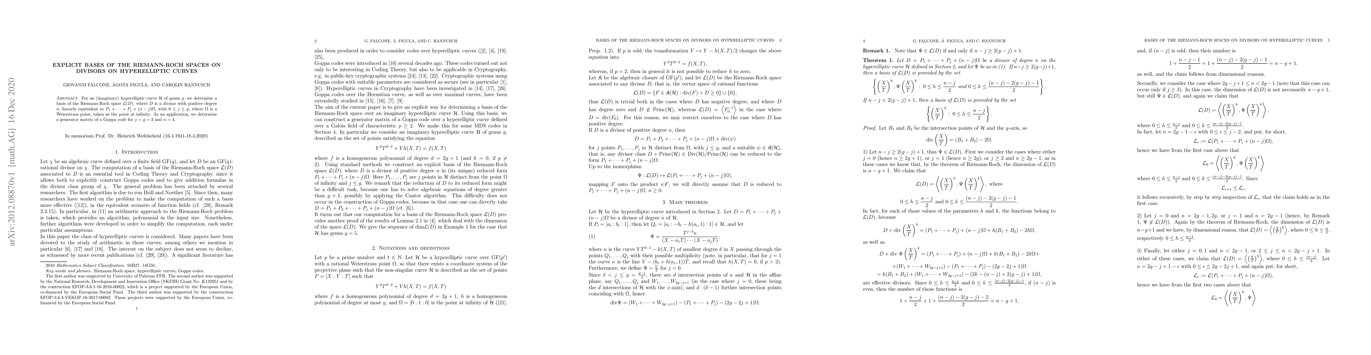 This paper determines an explicit basis for the Riemann-Roch space $\mathcal{L}(D)$ on a hyperelliptic curve $\mathcal{H}$ with divisor $D$ of degree $n$. It also provides a generator matrix for a Goppa code for a specific case with $j=g=3$ and $n=4$.