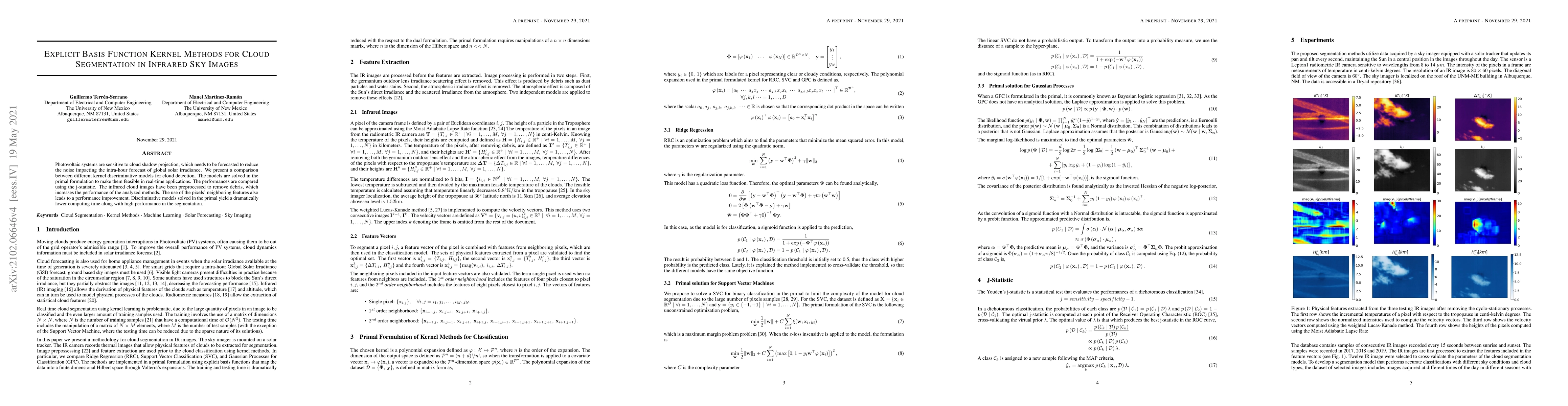 Photovoltaic systems are sensitive to cloud shadow projection, which needs to be forecasted to reduce the noise impacting the intra-hour forecast of global solar irradiance. We present a comparison between different kernel discriminative models for cloud detection. The models are solved in the primal formulation to make them feasible in real-time applications. The performances are compared using the j-statistic. The infrared cloud images have been preprocessed to remove debris, which increases the performance of the analyzed methods. The use of neighboring features of the pixels also leads to a performance improvement. Discriminative models solved in the primal yield a dramatically lower computing time along with high performance in the segmentation.