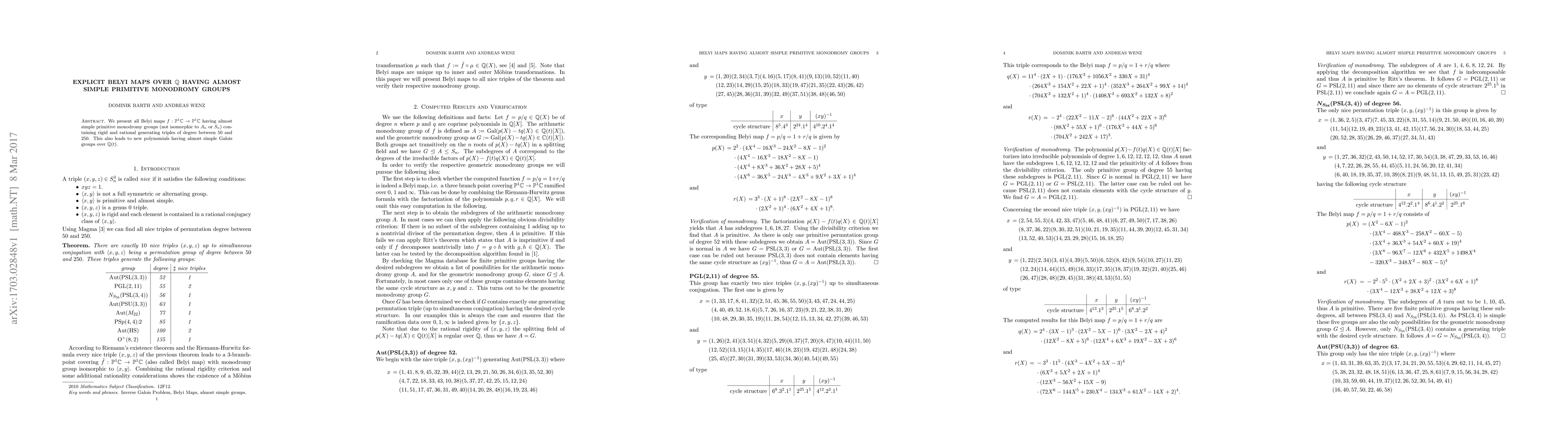 We present all Belyi maps P^1(C) -> P^1(C) having almost simple primitive monodromy groups (not isomorphic to A_n or S_n) containing rigid and rational generating triples of degree between 50 and 250. This also leads to new polynomials having almost simple Galois groups over Q(t).