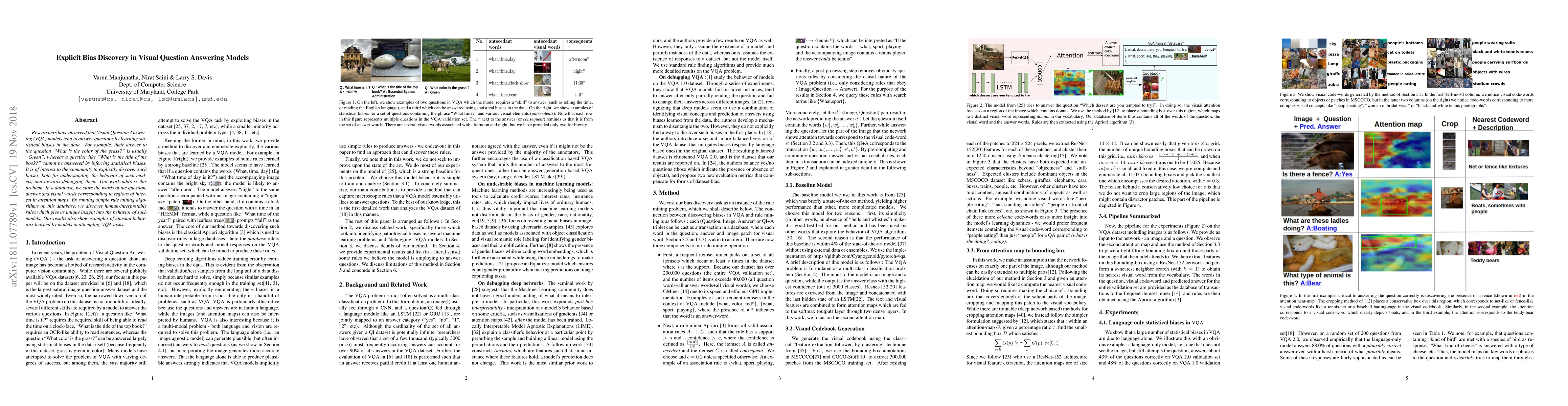 Researchers have observed that Visual Question Answering (VQA) models tend to answer questions by learning statistical biases in the data. For example, their answer to the question "What is the color of the grass?" is usually "Green", whereas a question like "What is the title of the book?" cannot be answered by inferring statistical biases. It is of interest to the community to explicitly discover such biases, both for understanding the behavior of such models, and towards debugging them. Our work address this problem. In a database, we store the words of the question, answer and visual words corresponding to regions of interest in attention maps. By running simple rule mining algorithms on this database, we discover human-interpretable rules which give us unique insight into the behavior of such models. Our results also show examples of unusual behaviors learned by models in attempting VQA tasks.