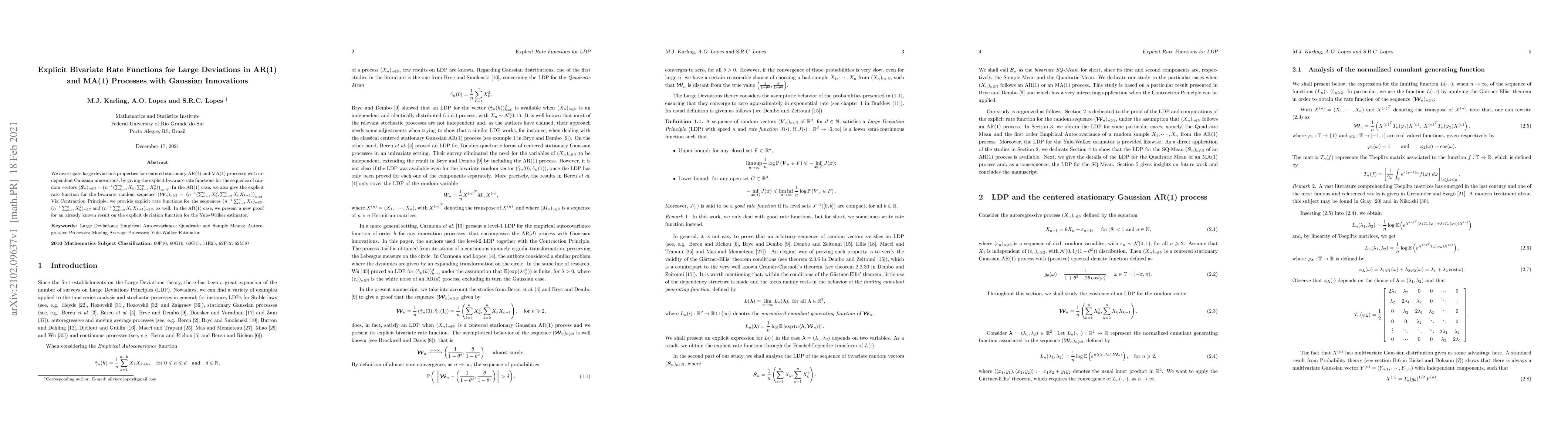 The research investigates large deviations properties for centered stationary AR(1) and MA(1) processes with independent Gaussian innovations, providing explicit bivariate rate functions for sequences of random vectors.