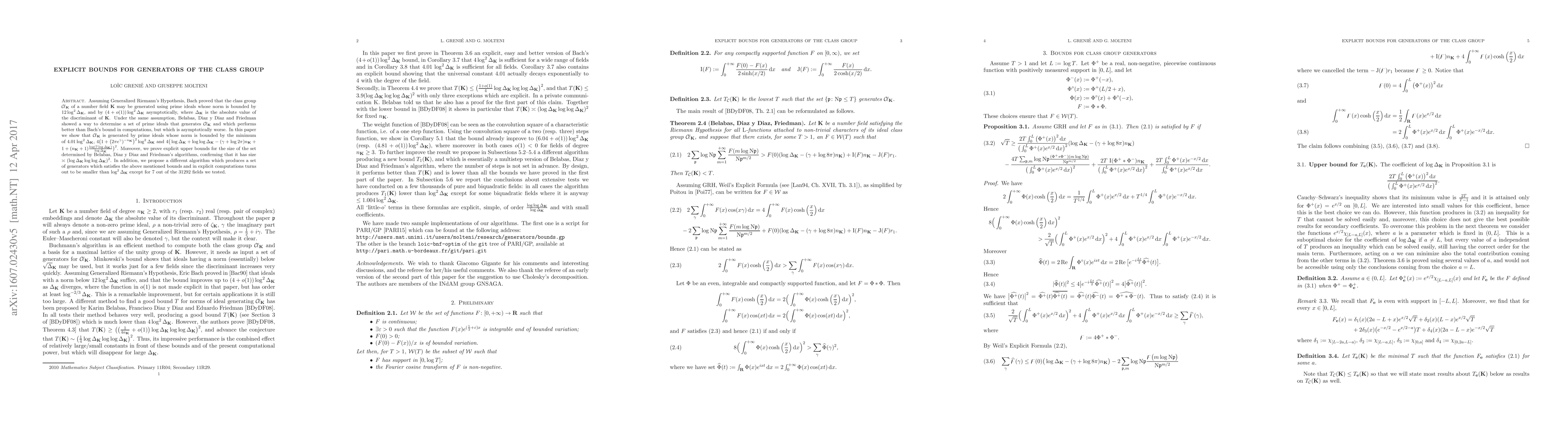 Assuming Generalized Riemann's Hypothesis, Bach proved that the class group $\mathcal C\!\ell_{\mathbf K}$ of a number field ${\mathbf K}$ may be generated using prime ideals whose norm is bounded by $12\log^2\Delta_{\mathbf K}$, and by $(4+o(1))\log^2\Delta_{\mathbf K}$ asymptotically, where $\Delta_{\mathbf K}$ is the absolute value of the discriminant of ${\mathbf K}$. Under the same assumption, Belabas, Diaz y Diaz and Friedman showed a way to determine a set of prime ideals that generates $\mathcal C\!\ell_{\mathbf K}$ and which performs better than Bach's bound in computations, but which is asymptotically worse. In this paper we show that $\mathcal C\!\ell_{\mathbf K}$ is generated by prime ideals whose norm is bounded by the minimum of $4.01\log^2\Delta_{\mathbf K}$, $4\big(1+\big(2\pi e^{\gamma})^{-n_{\mathbf K}}\big)^2\log^2\Delta_{\mathbf K}$ and $4\big(\log\Delta_{\mathbf K}+\log\log\Delta_{\mathbf K}-(\gamma+\log 2\pi)n_{\mathbf K}+1+(n_{\mathbf K}+1)\frac{\log(7\log\Delta_{\mathbf K})}{\log\Delta_{\mathbf K}}\big)^2$. Moreover, we prove explicit upper bounds for the size of the set determined by Belabas, Diaz y Diaz and Friedman's algorithms, confirming that it has size $\asymp (\log\Delta_{\mathbf K}\log\log\Delta_{\mathbf K})^2$. In addition, we propose a different algorithm which produces a set of generators which satisfies the above mentioned bounds and in explicit computations turns out to be experimentally smaller than $\log^2\Delta_{\mathbf K}$ except for 7 out of 31000 fields.
