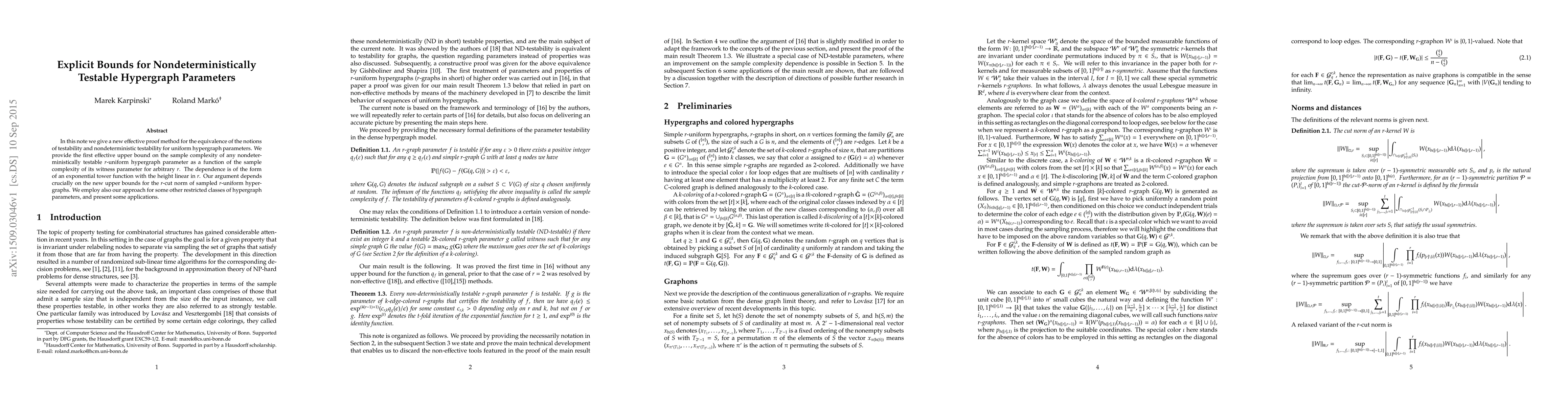 In this note we give a new effective proof method for the equivalence of the notions of testability and nondeterministic testability for uniform hypergraph parameters. We provide the first effective upper bound on the sample complexity of any nondeterministically testable $r$-uniform hypergraph parameter as a function of the sample complexity of its witness parameter for arbitrary $r$. The dependence is of the form of an exponential tower function with the height linear in $r$. Our argument depends crucially on the new upper bounds for the $r$-cut norm of sampled $r$-uniform hypergraphs. We employ also our approach for some other restricted classes of hypergraph parameters, and present some applications.