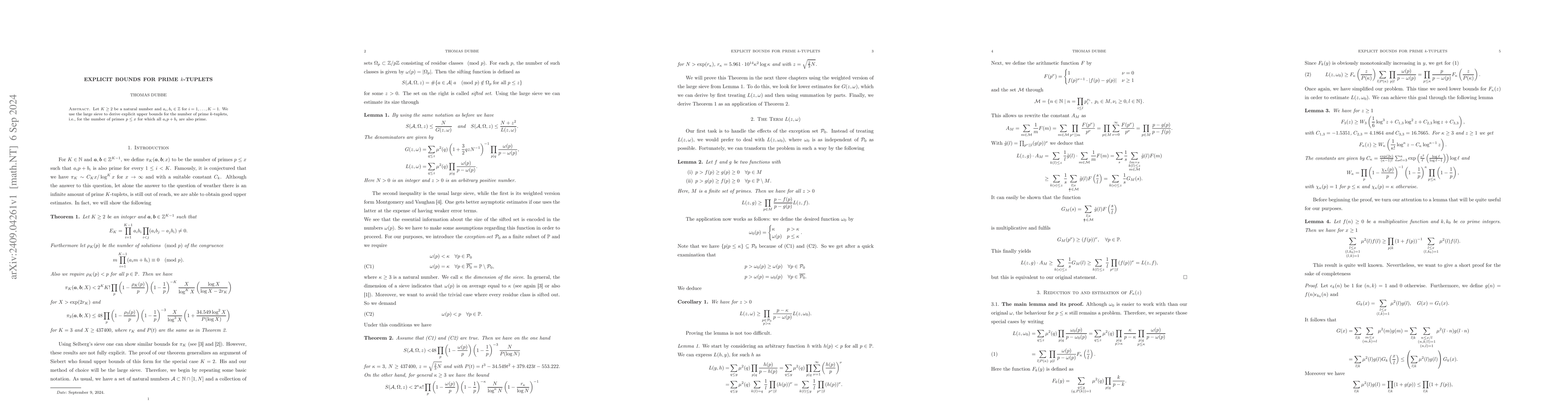 Let $K\geq 2$ be a natural number and $a_i,b_i\in\mathbb{Z}$ for $i=1,\ldots,K-1$. We use the large sieve to derive explicit upper bounds for the number of prime $k$-tuplets, i.e., for the number of primes $p\leq x$ for which all $a_ip+b_i$ are also prime.