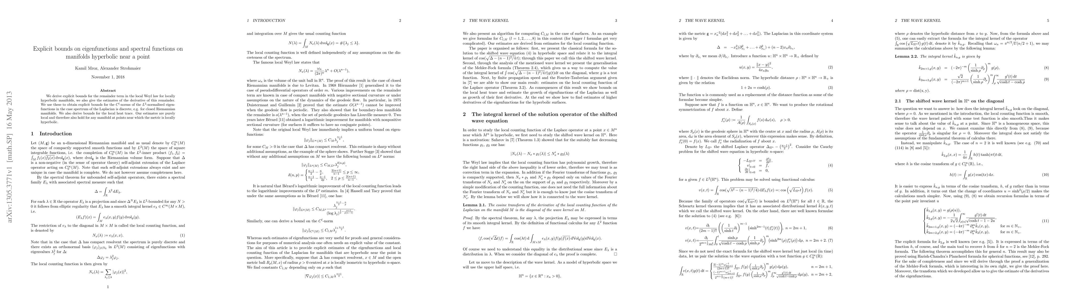 We derive explicit bounds for the remainder term in the local Weyl law for locally hyperbolic manifolds, we also give the estimates of the derivative of this remainder. We use these to obtain explicit bounds for the C^k-norms of the L^2-normalised eigenfunctions in the case spectrum of the Laplacian is discrete, e.g. for closed Riemannian manifolds. We also derive bounds for the local heat trace. Our estimates are purely local and therefore also hold for any manifold at points near which the metric is locally hyperbolic.