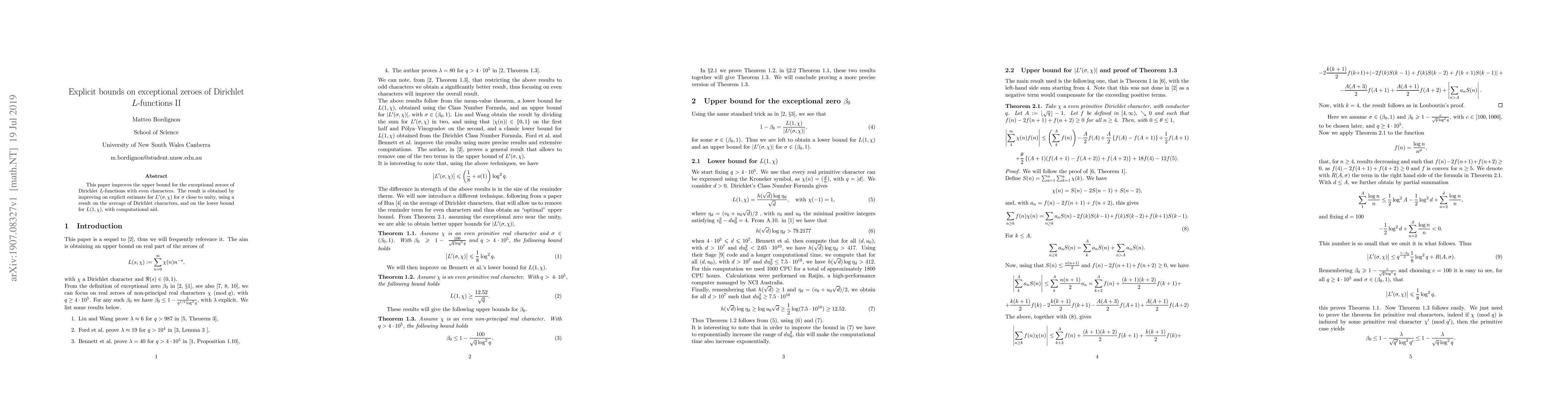 This paper improves the upper bound for the exceptional zeroes of Dirichlet L-functions with even characters. The result is obtained by improving on explicit estimate for $L'(\sigma;\chi)$ for $\sigma$ close to unity, using a result on the average of Dirichlet characters, and on the lower bound for $L(1;\chi)$, with computational aid.
