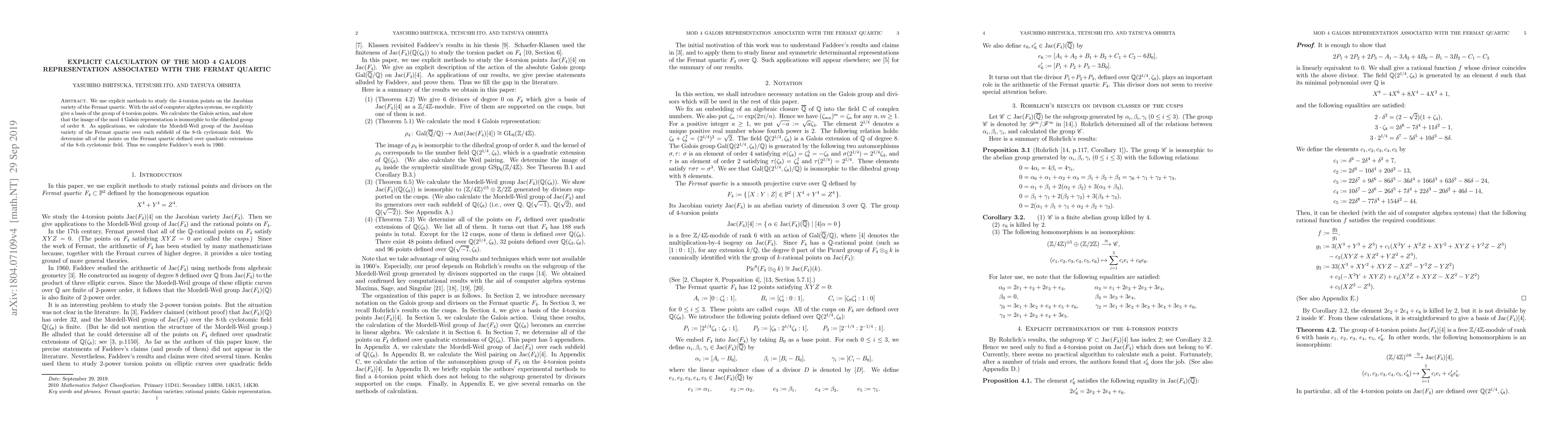 We use explicit methods to study the 4-torsion points on the Jacobian variety of the Fermat quartic. With the aid of computer algebra systems, we explicitly give a basis of the group of 4-torsion points. We calculate the Galois action, and show that the image of the mod 4 Galois representation is isomorphic to the dihedral group of order 8. As applications, we calculate the Mordell-Weil group of the Jacobian variety of the Fermat quartic over each subfield of the 8-th cyclotomic field. We determine all of the points on the Fermat quartic defined over quadratic extensions of the 8-th cyclotomic field. Thus we complete Faddeev's work in 1960.
