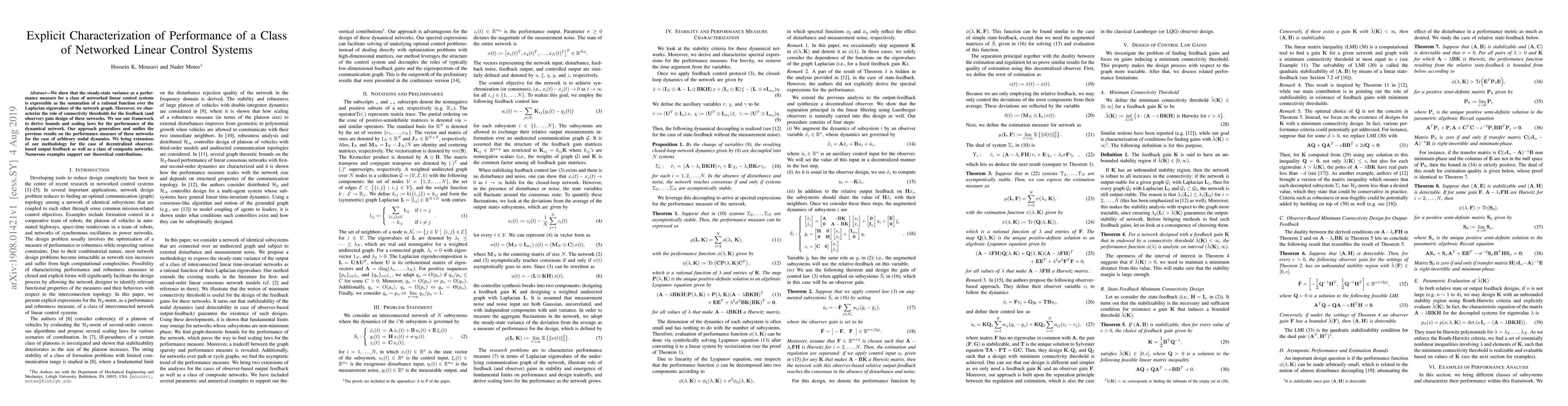 We show that the steady-state variance as a performance measure for a class of networked linear control systems is expressible as the summation of a rational function over the Laplacian eigenvalues of the network graph. Moreover, we characterize the role of connectivity thresholds for the feedback (and observer) gain design of these networks. We use our framework to derive bounds and scaling laws for the performance of the dynamical network. Our approach generalizes and unifies the previous results on the performance measure of these networks for the case of arbitrary nodal dynamics. We bring extensions of our methodology for the case of decentralized observer-based output feedback as well as a class of composite networks. Numerous examples support our theoretical contributions.