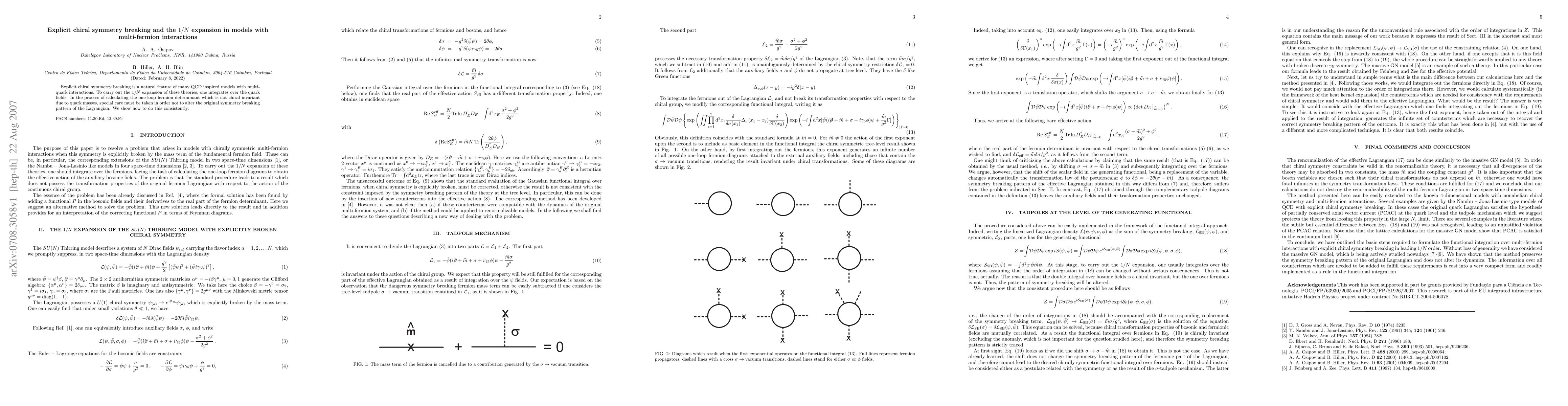 This paper investigates explicit chiral symmetry breaking in QCD-inspired models with multi-quark interactions, focusing on the 1/N expansion. The authors demonstrate a consistent method to calculate the one-loop fermion determinant without altering the original symmetry breaking pattern.