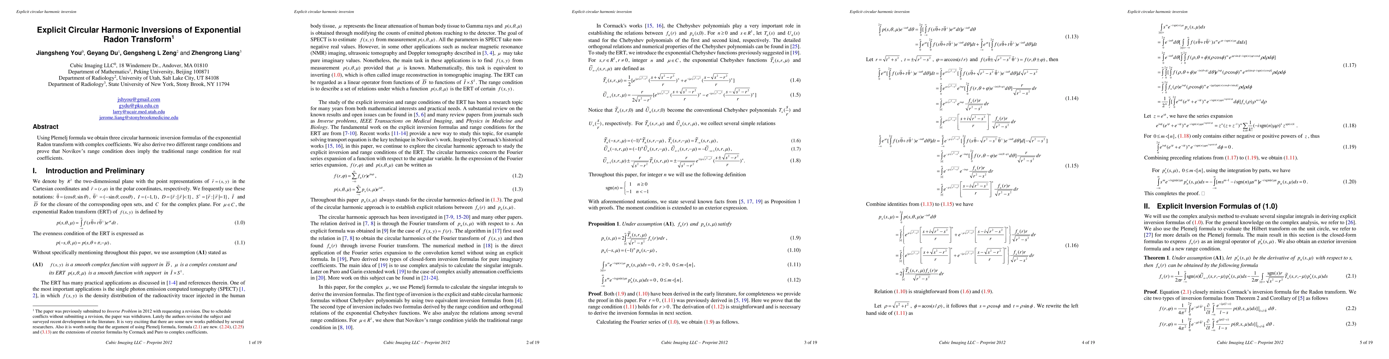 Using Plemelj formula we obtain three circular harmonic inversion formulas of the exponential Radon transform with complex coefficients. We also derive two different range conditions and prove that Novikov's range condition does imply the traditional range condition for real coefficients.